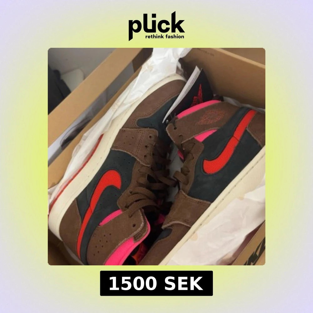 Säljer ett par Nike Air Jordan 1 High Travis Scott med bruna och svarta paneler, röd swoosh och rosa detaljer. Skorna har snörning, hög siluett och är tillverkade i mocka och skinn. Perfekta för dig som vill sticka ut med en ikonisk sneaker.