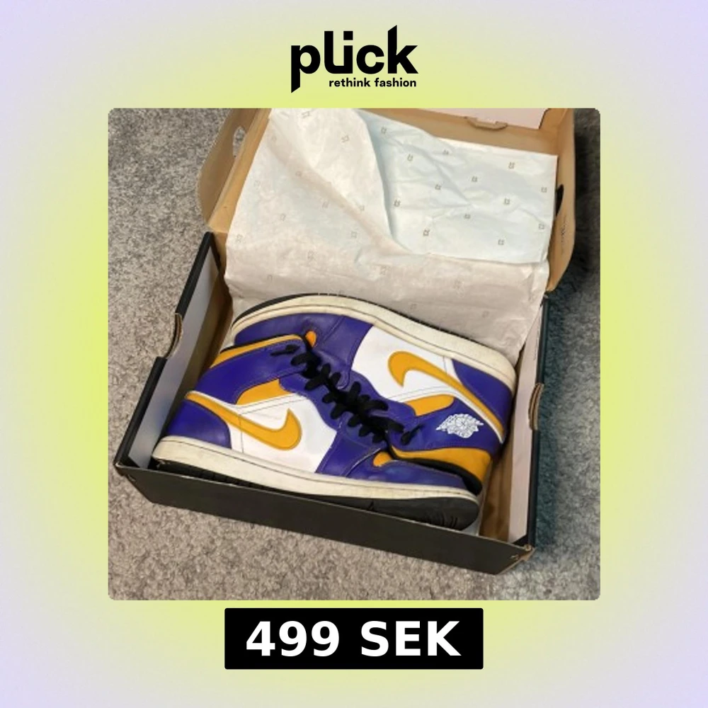 Nike Air Jordan 1 sneakers i Lakers-inspirerad färg med lila, gult och vitt skinn. Klassisk high-top siluett med svart snörning, vit sula och ikoniska Jordan Wings-loggan på sidan. Perfekta för dig som vill sticka ut med färg och streetstyle. Storlek 40,5