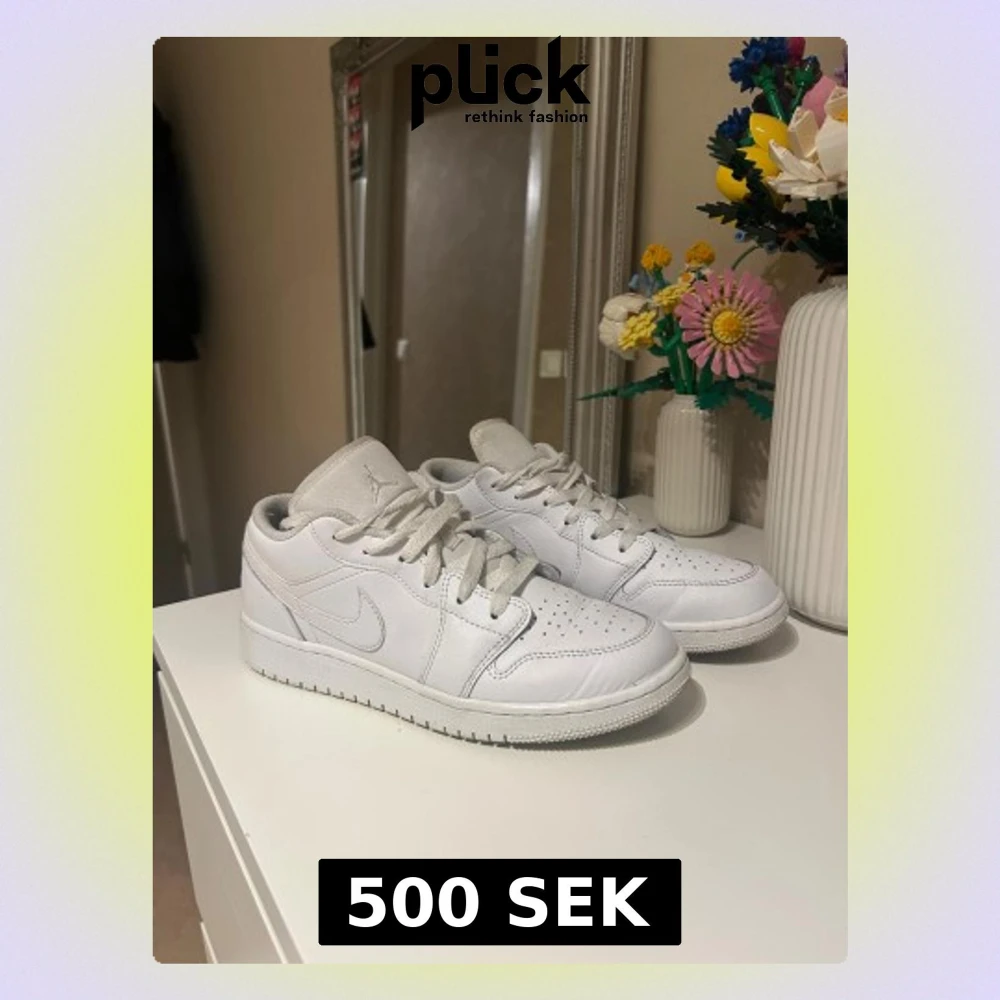 Säljer dessa Nike Air Jordan 1 low i hel vit. Skorna är i storlek 38,5! Skorna är i bra skick, dock är skosnöret ”sönder” på högra skorn. Skriv för ytterligare frågor:))