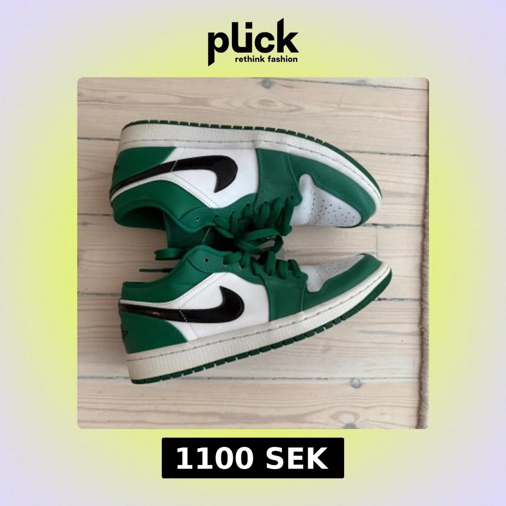 Säljer ett par Nike Air Jordan 1 Low i fräscha färger – vitt och grönt med svarta swoosh-detaljer. Klassisk siluett med snörning, rund tå och platt sula. Skorna är i skinn och har den ikoniska Air Jordan-loggan på hälen. Perfekta för dig som vill sticka ut med stil. Mycket bra skick, köpt i Kanada, kan skickas eller hämtas :)