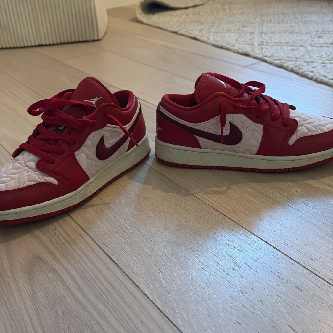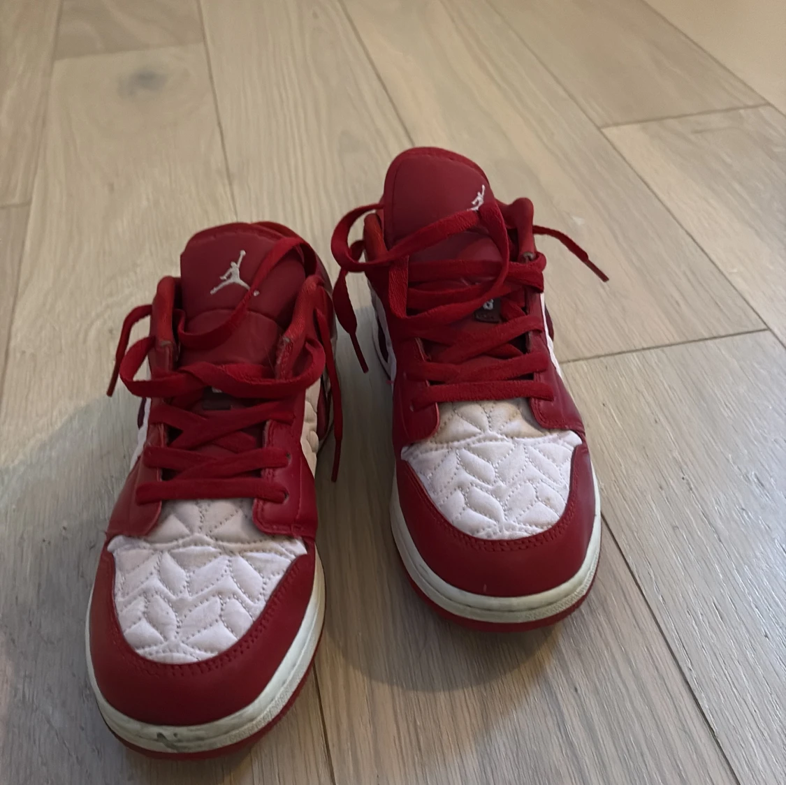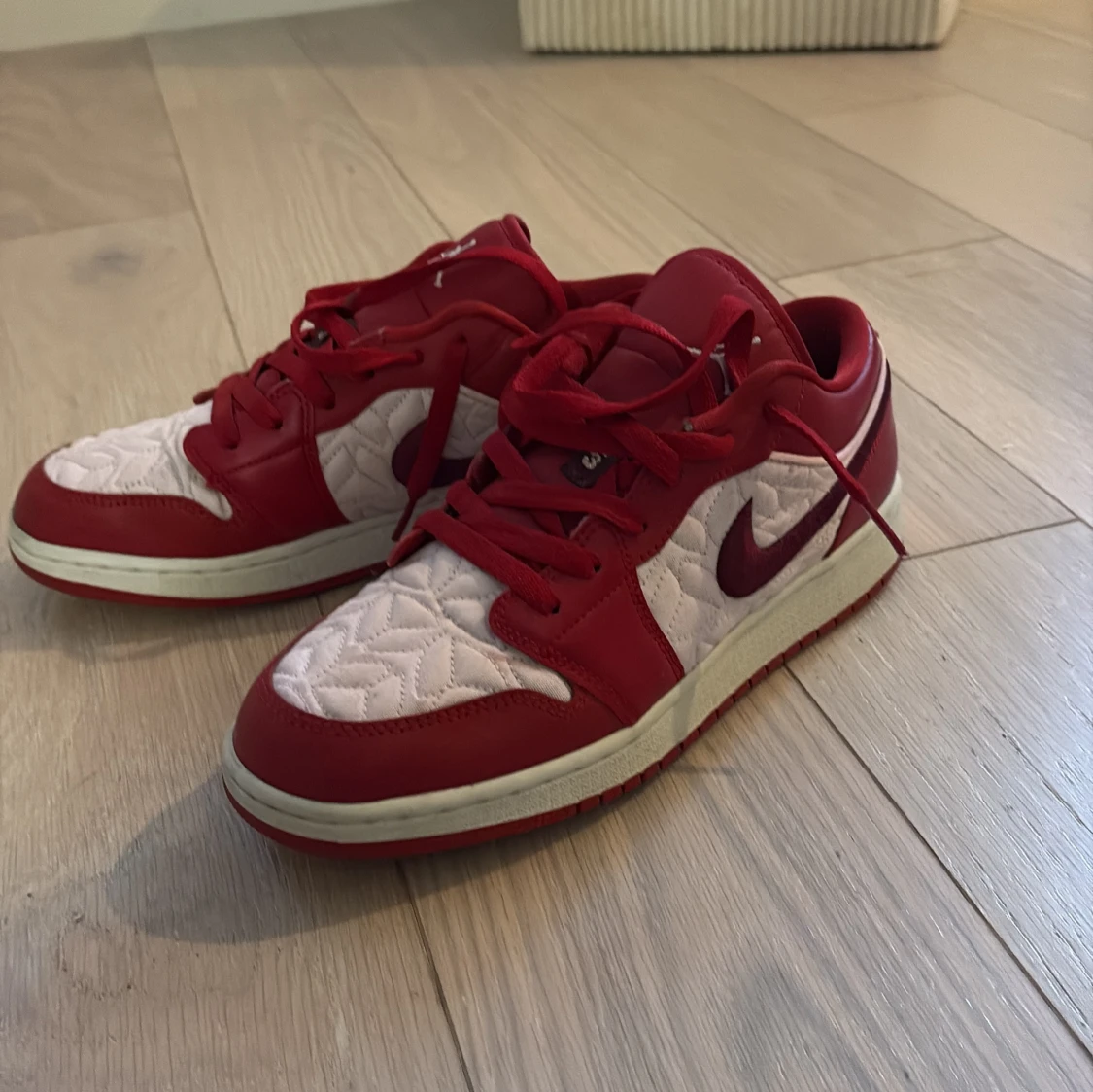 Nike Air Jordan 1 Low sneakers i rött och vitt med quiltad textil på ovandelen och röda skinnpaneler. Klassisk Air Jordan-logga på hälen och vit mellansula. Snygg kontrast mellan material och färger, perfekt för dig som gillar unika detaljer.