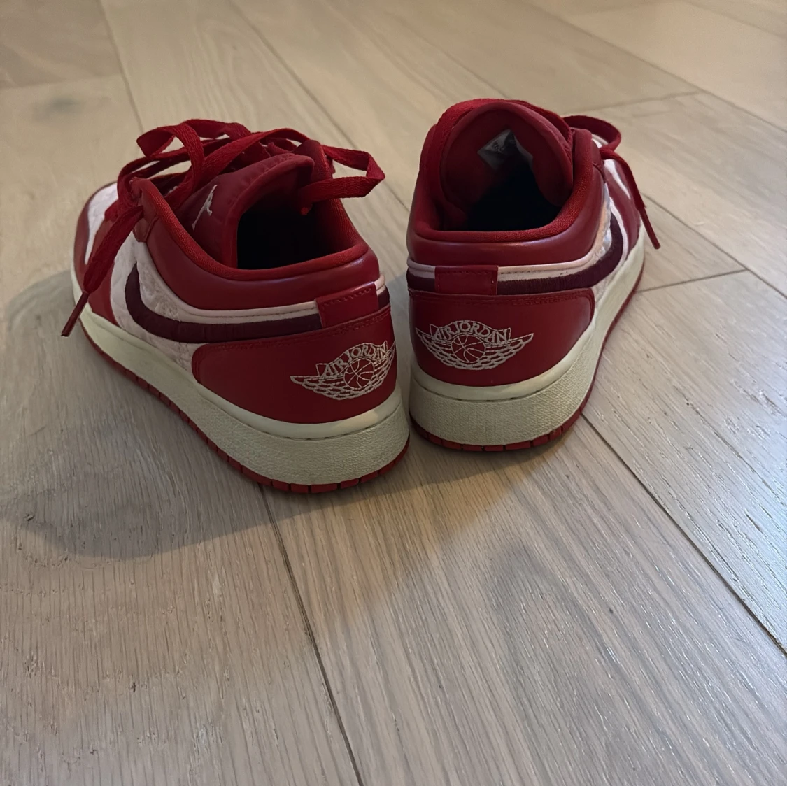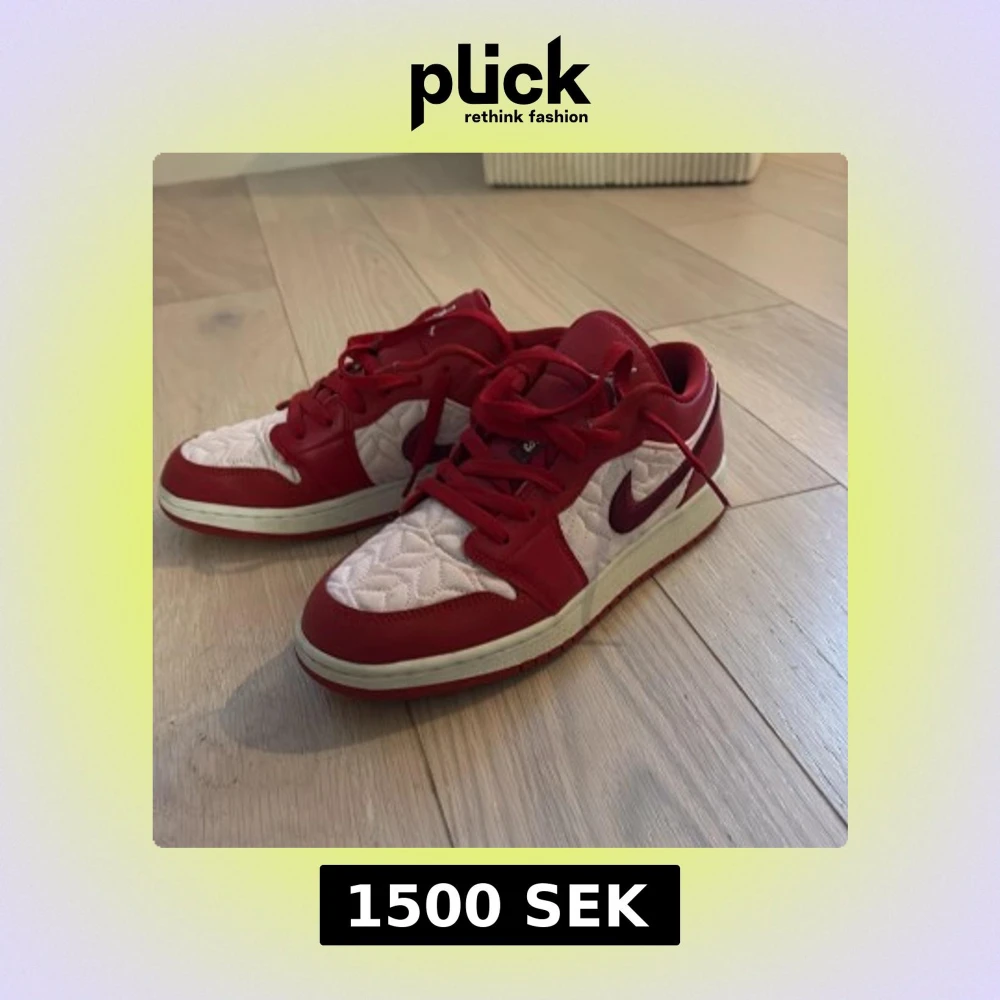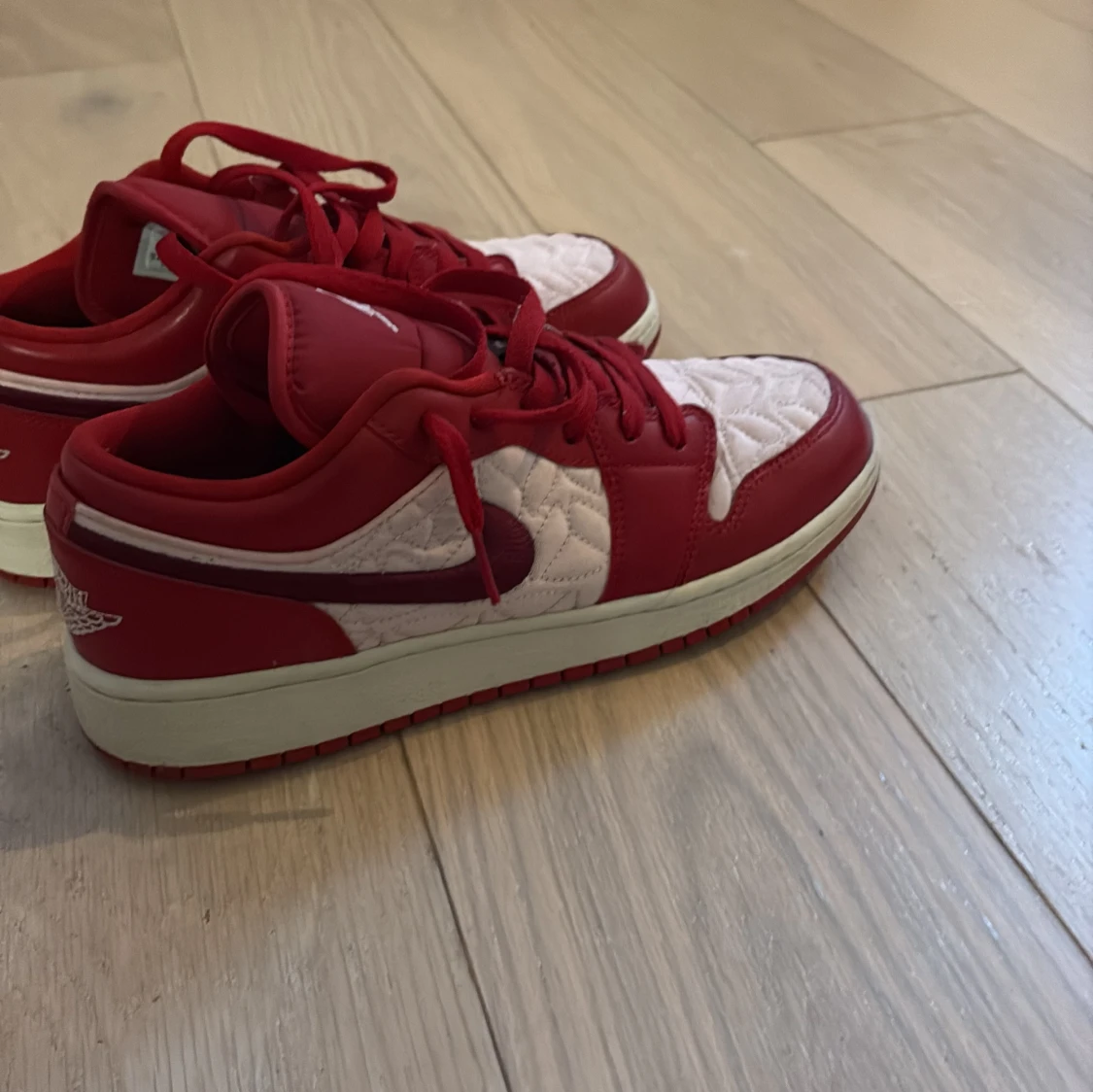 Nike Air Jordan 1 Low sneakers i rött och vitt med quiltad textil på ovandelen och röda skinnpaneler. Klassisk Air Jordan-logga på hälen och vit mellansula. Snygg kontrast mellan material och färger, perfekt för dig som gillar unika detaljer.