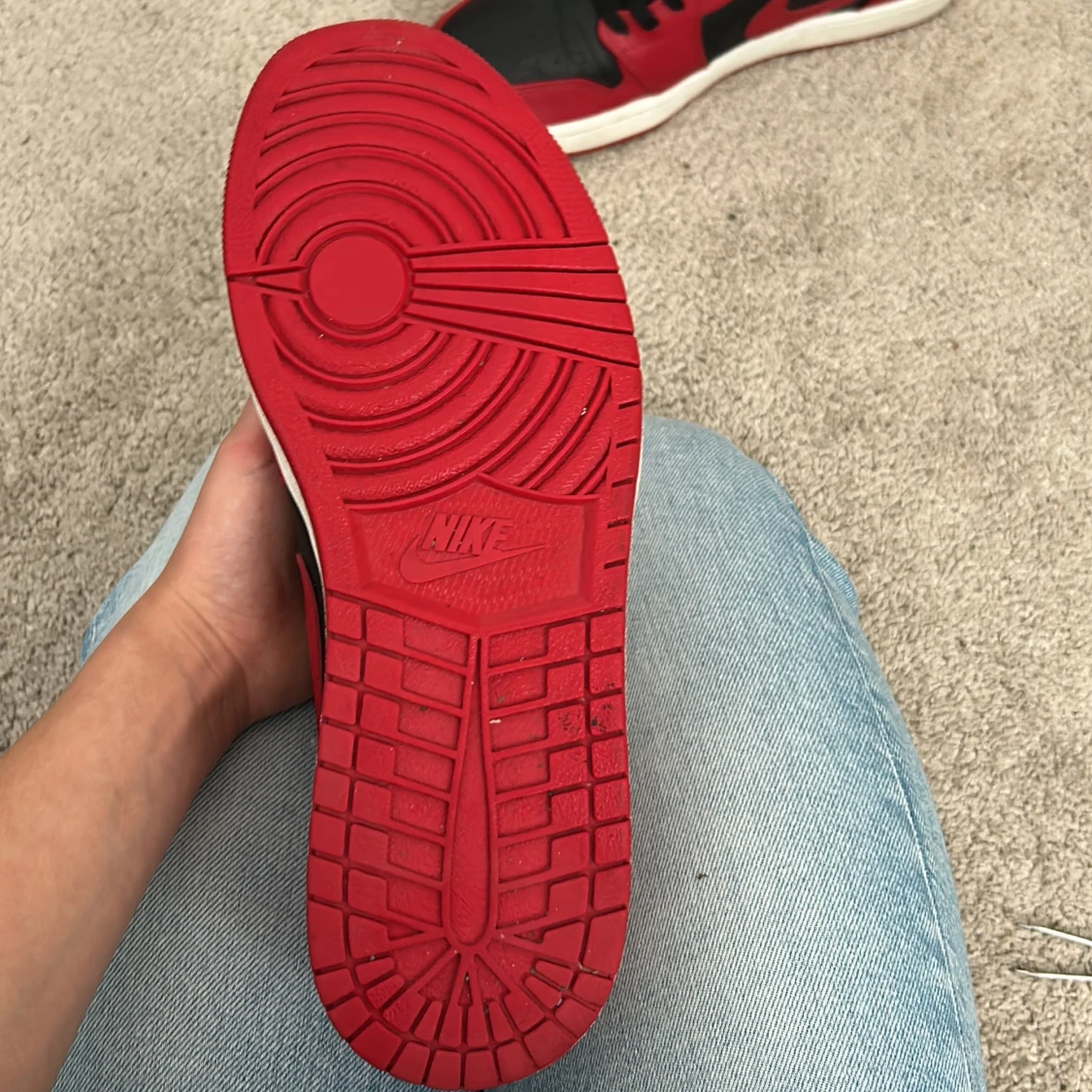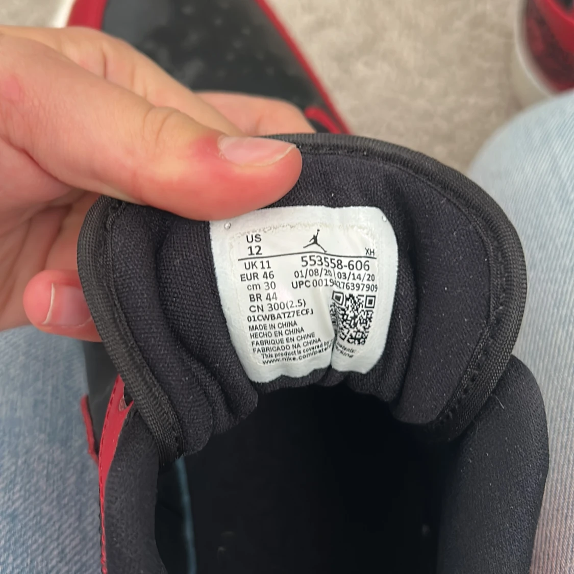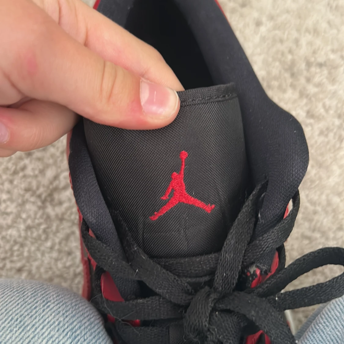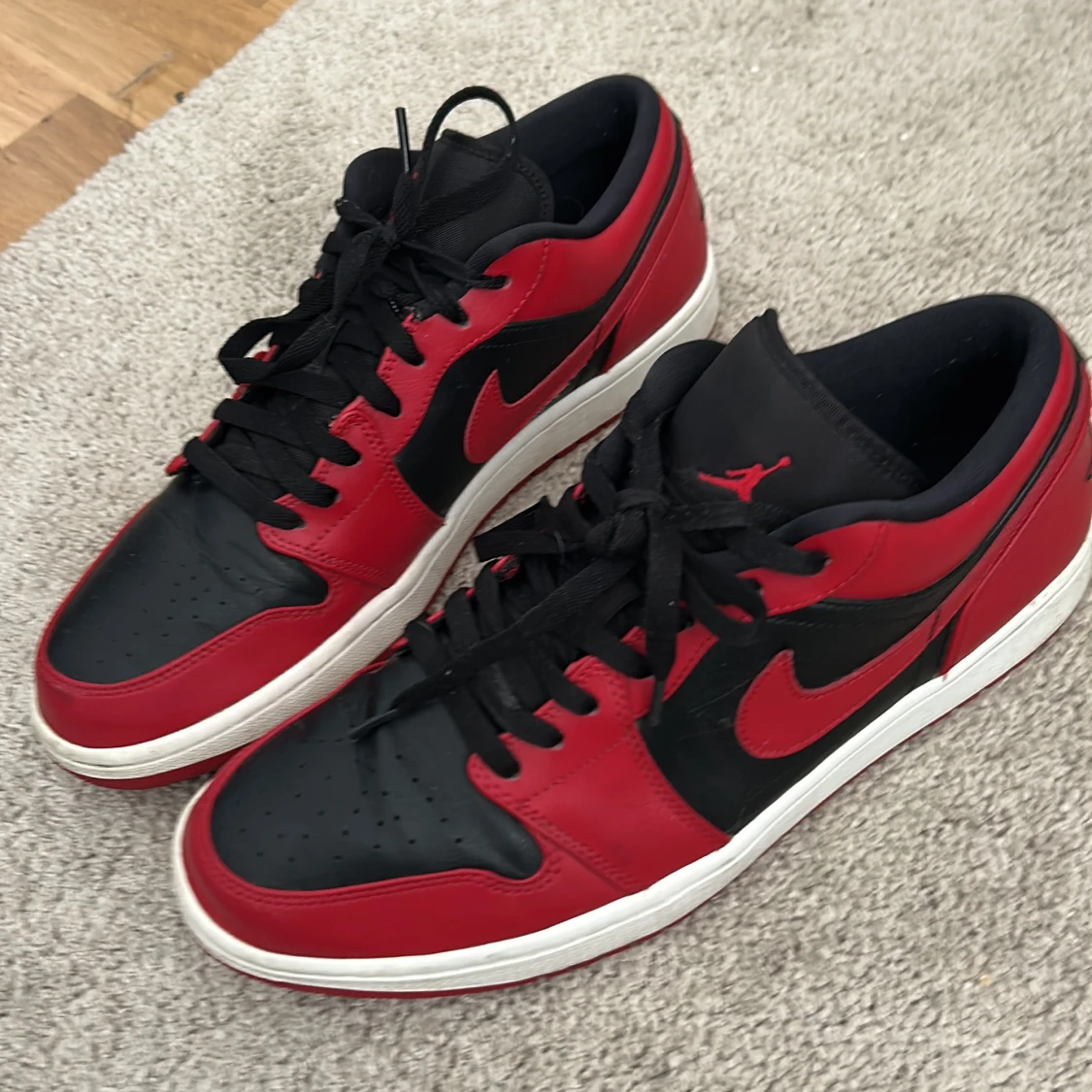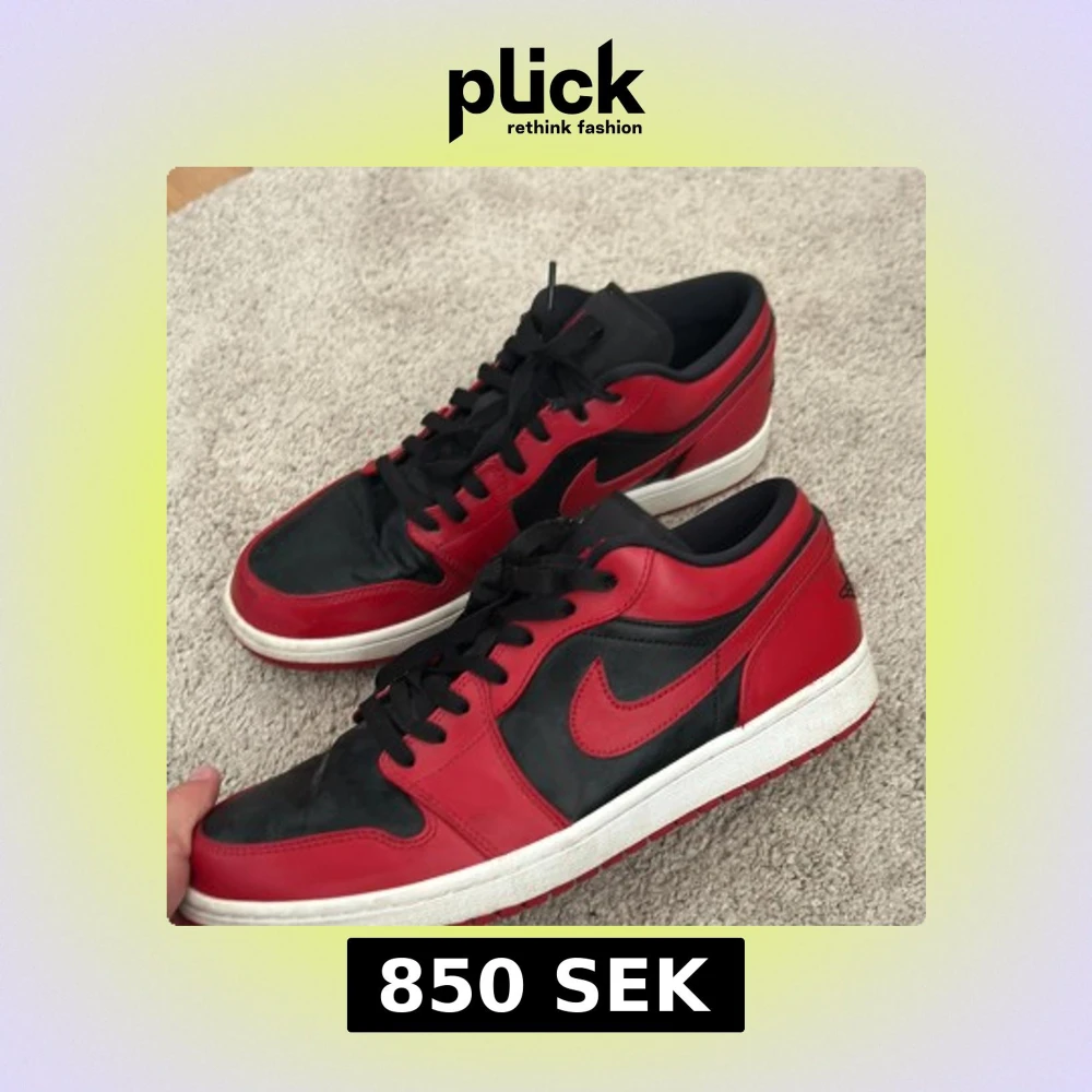 Säljer ett par Nike Air Jordan 1 Low i svart och rött med klassisk Jumpman-logga på plösen. Skorna har svart snörning, vit sula och röd yttersula. Perfekta för dig som gillar streetwear och sneakers med ikonisk design. Storlek 46! Använda fåtal gånger