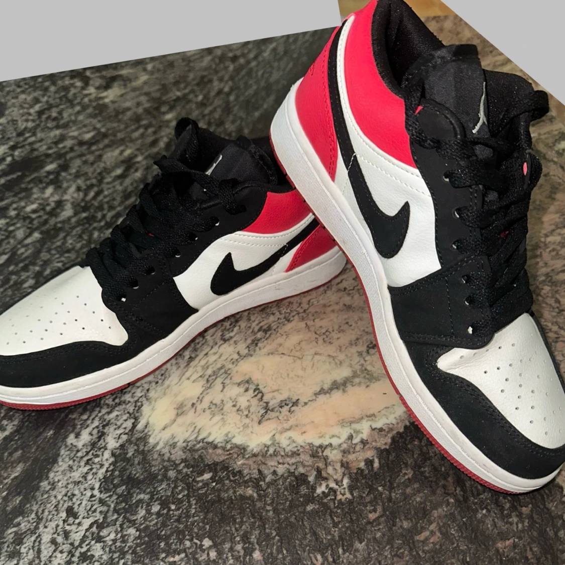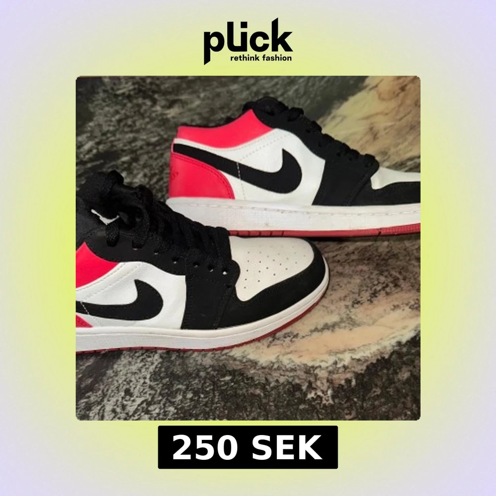 Snygga Nike Air Jordan 1 Low sneakers i svart, vitt och rött. Klassisk design med svart swoosh, perforerad tå och lågt skaft. Ovandel i skinn och syntet, svart snörning och röd yttersula. Perfekta för dig som vill sticka ut med en ikonisk streetstyle.