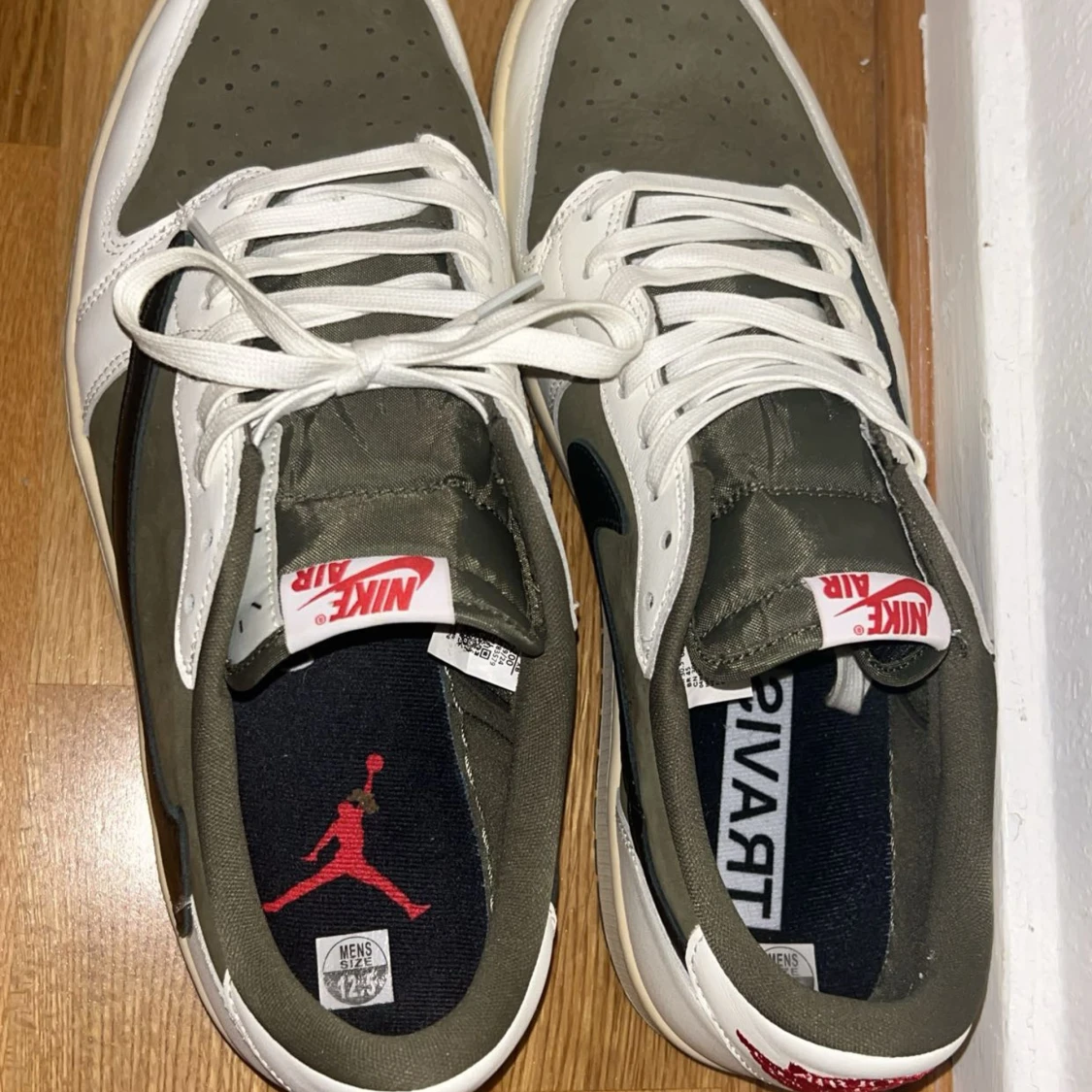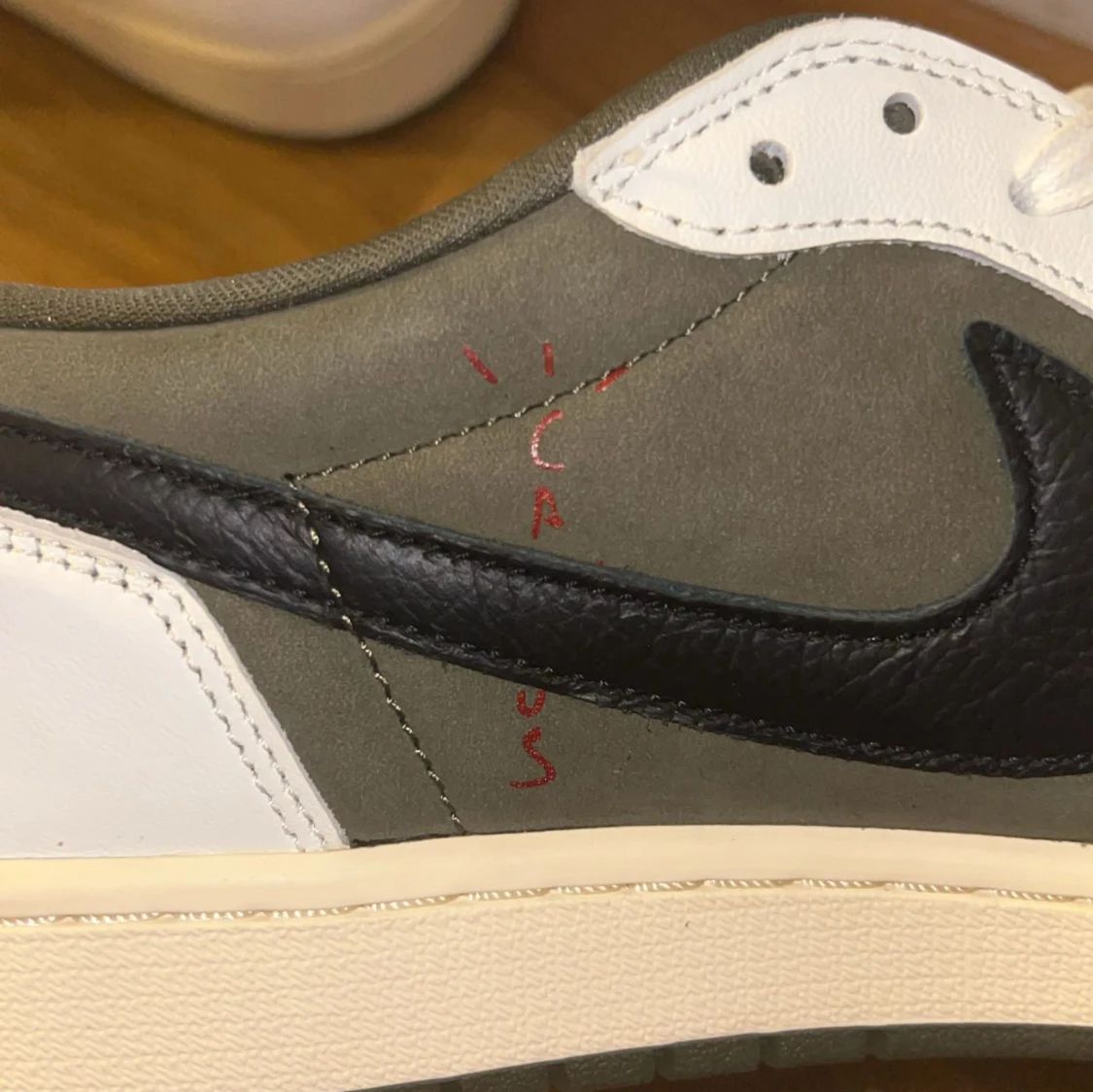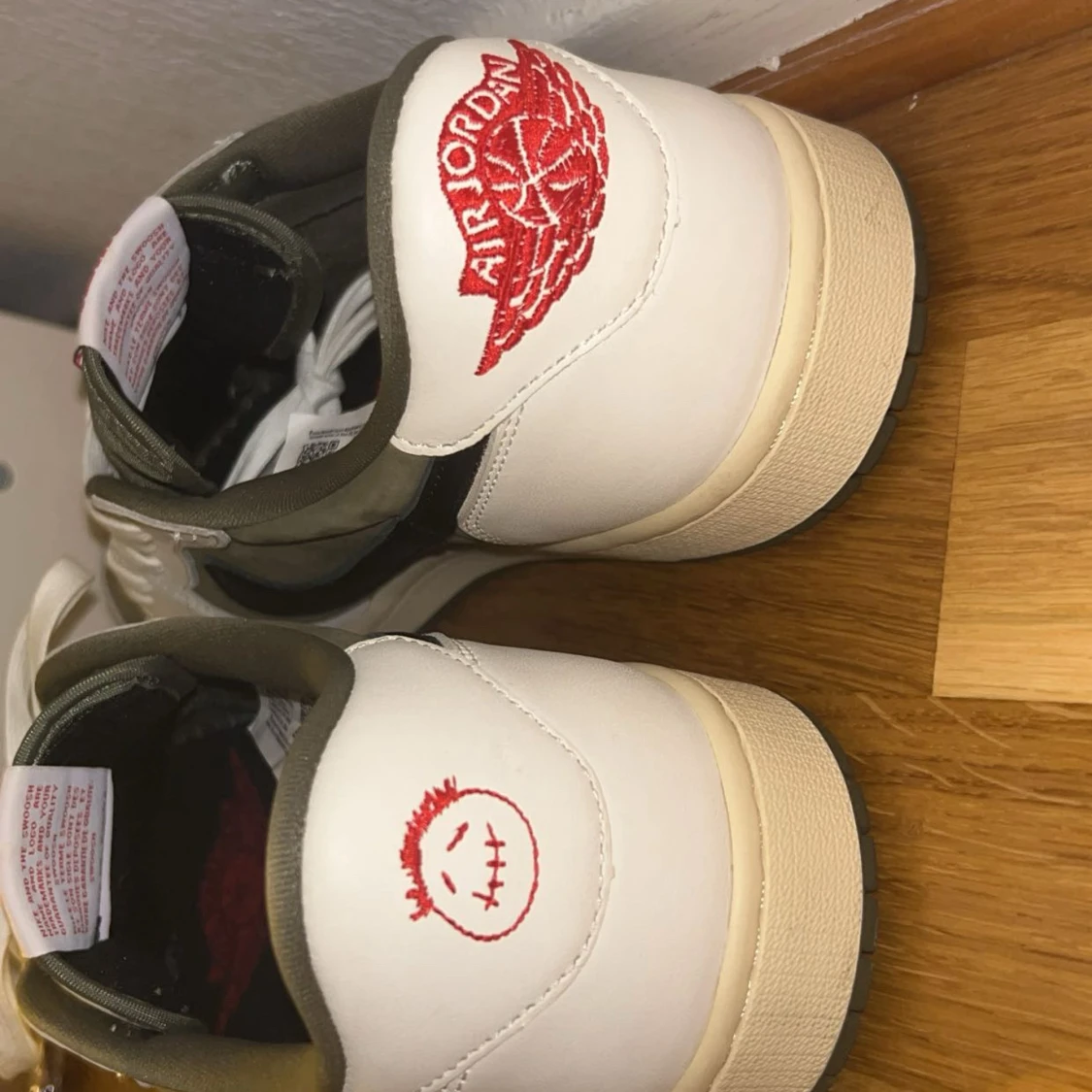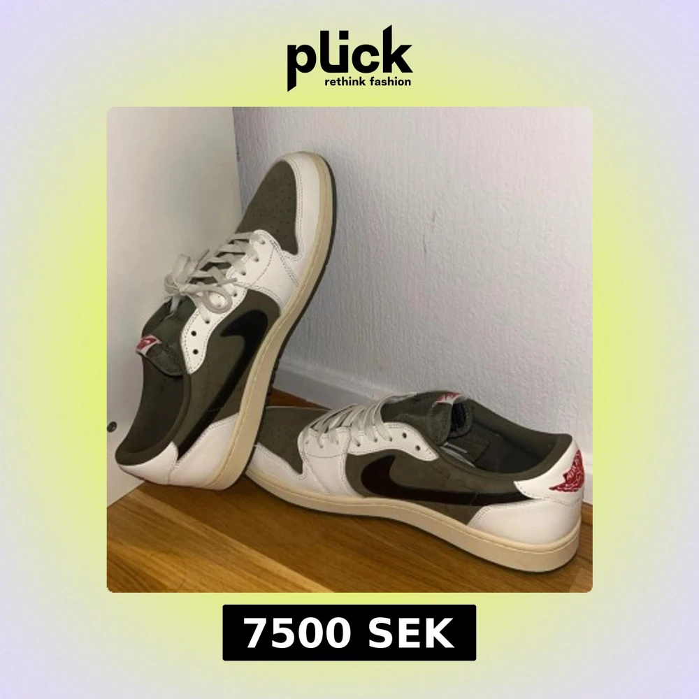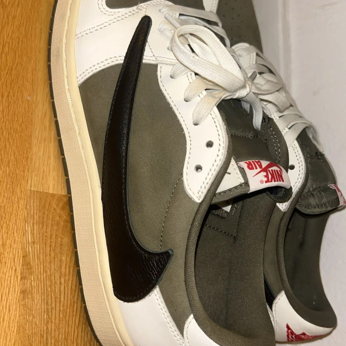 Nike Air Jordan 1 Low Travis Scott med olivgröna och vita paneler, svart omvänd swoosh och röda broderade detaljer på hälen. Skorna har snörning, perforerad tå och en beige sula.