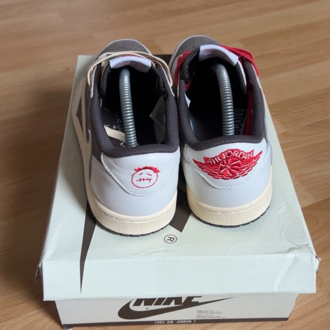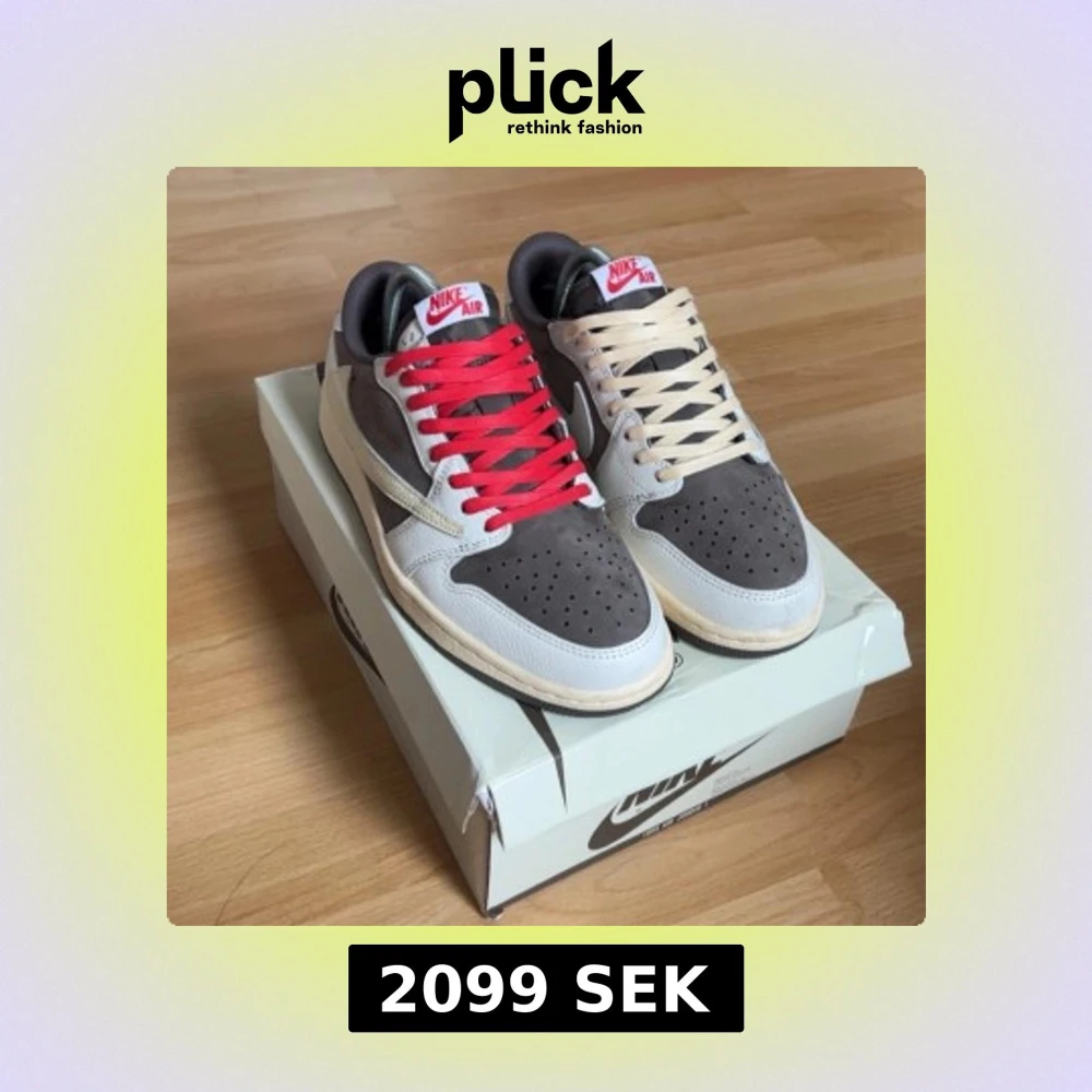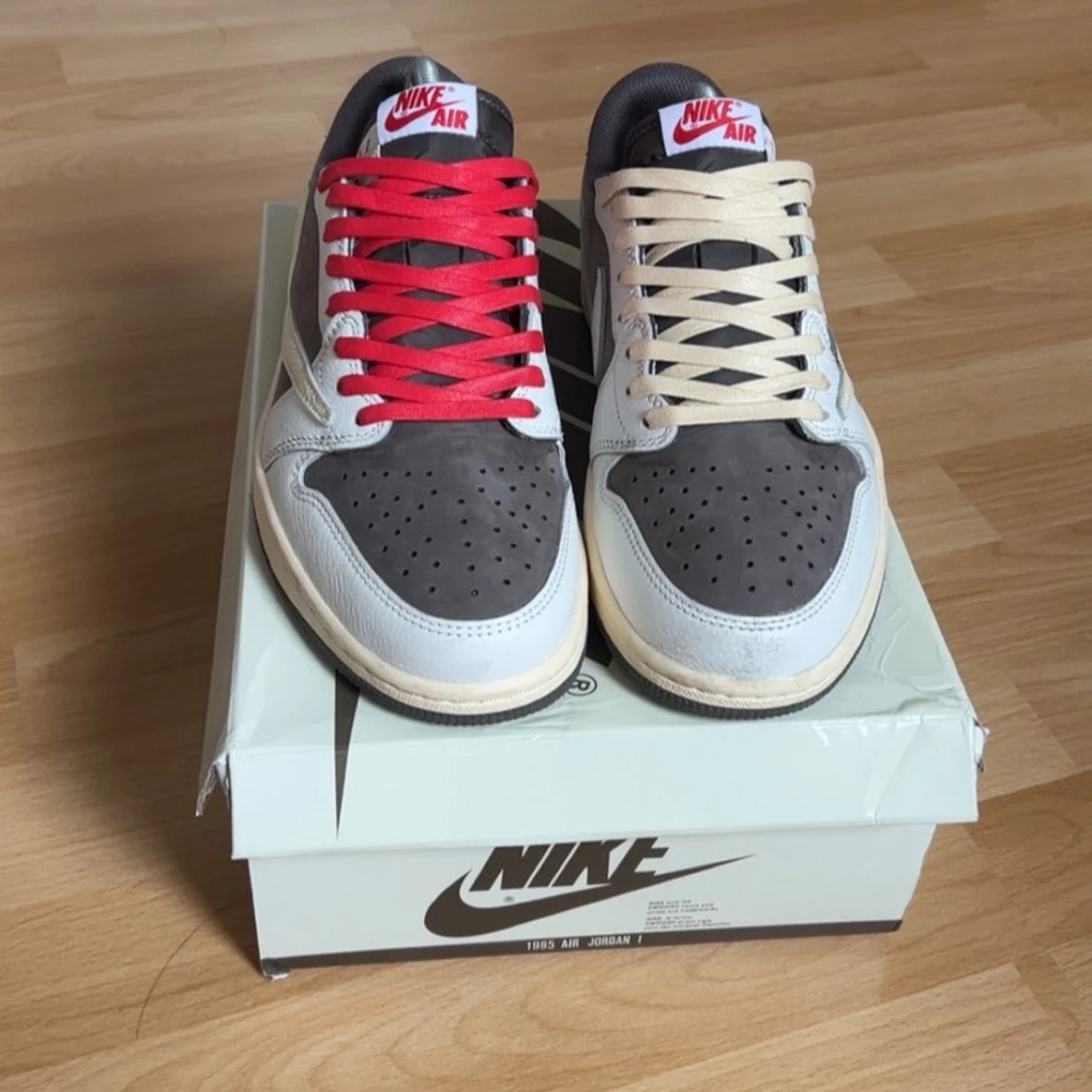 Nike Air Jordan 1 Low Travis Scott med coola kontrasterande snören, ett par röda och ett par beige. Skorna har grå mocka på tå och paneler, vit skinn på sidorna och bak, samt mörkbruna detaljer. Ikoniska Air Jordan-loggan och Travis Scott-emblem broderade i rött på hälen. Priset kan diskuteras👍