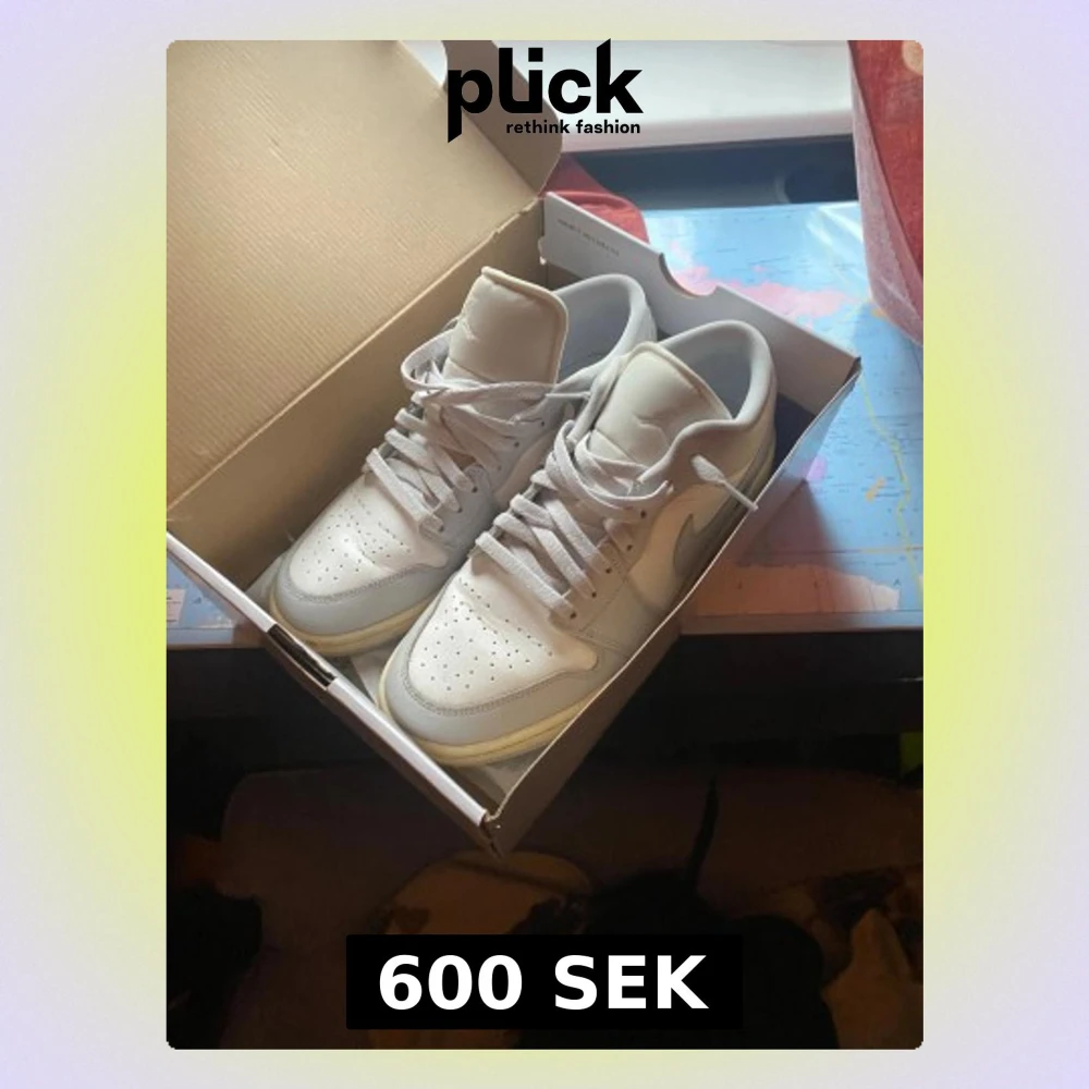 Säljer ett par Nike Air Jordan 1 Low i helvitt skinn. Klassisk siluett med perforerad tåbox, vita snören och ikoniska swoosh-loggan på sidan. Kommer i originalkartong med guldfärgad Jumpman-logga. Perfekta för dig som gillar clean och stilren sneakerstil.