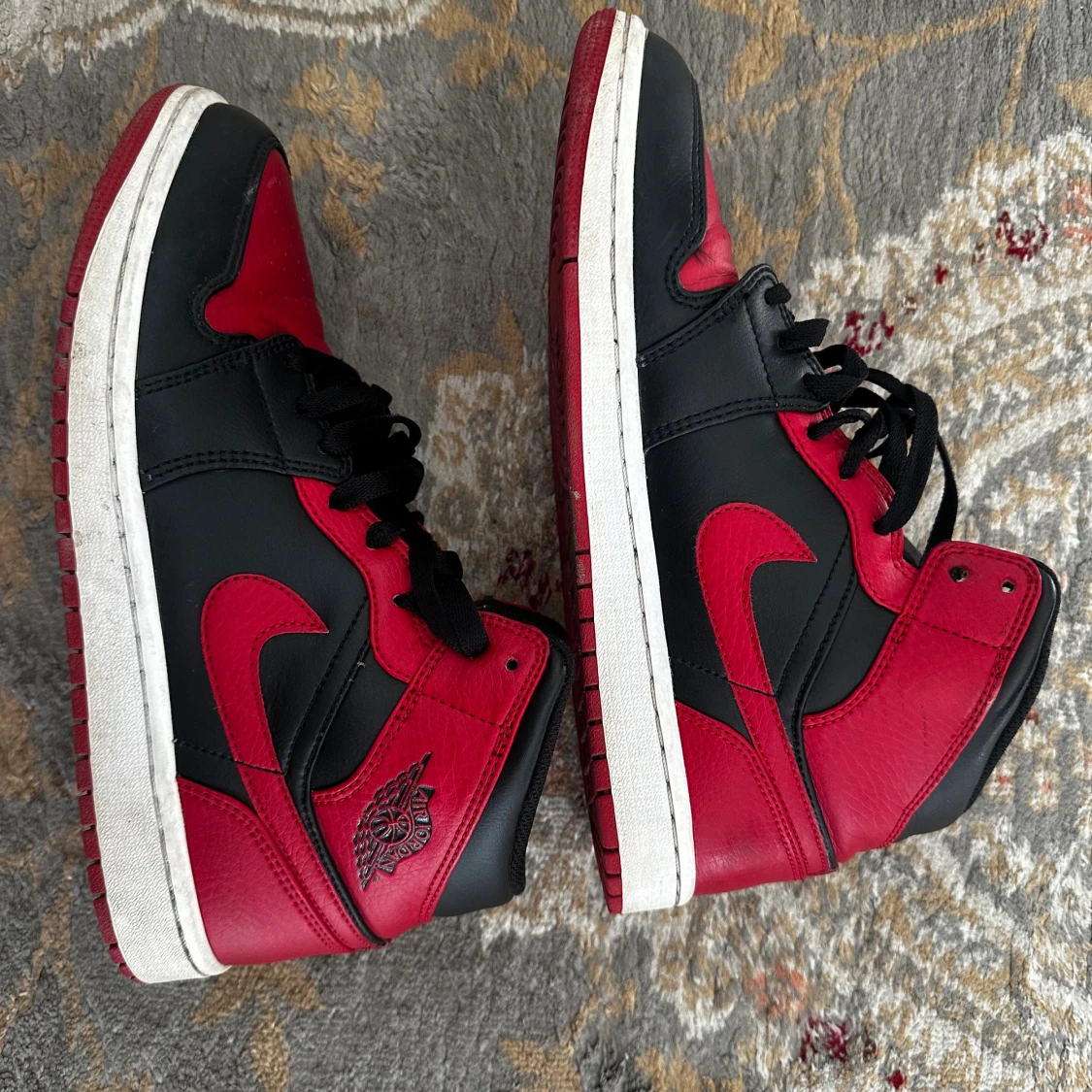 Säljer ett par Nike Air Jordan 1 Mid Banned i klassisk röd och svart färg. Skorna har snyggt läder, röd swoosh och ikonisk Air Jordan-logga på sidan. Perfekta för dig som vill sticka ut med en tidlös sneaker. Köptes på restocks.net för 2 år sedan för 2500 kr, pris kan diskuteras