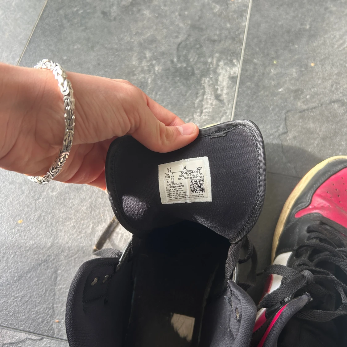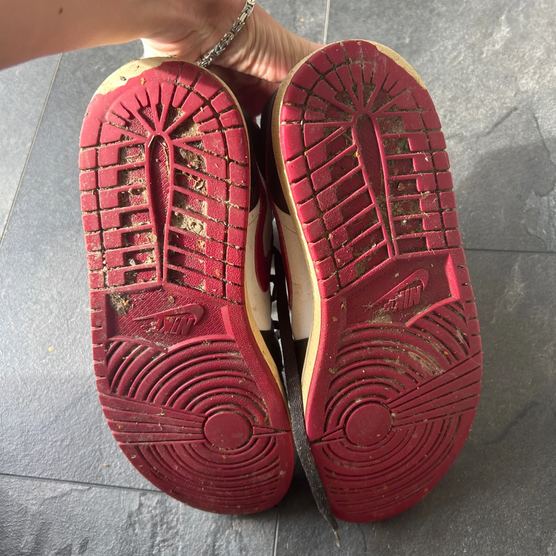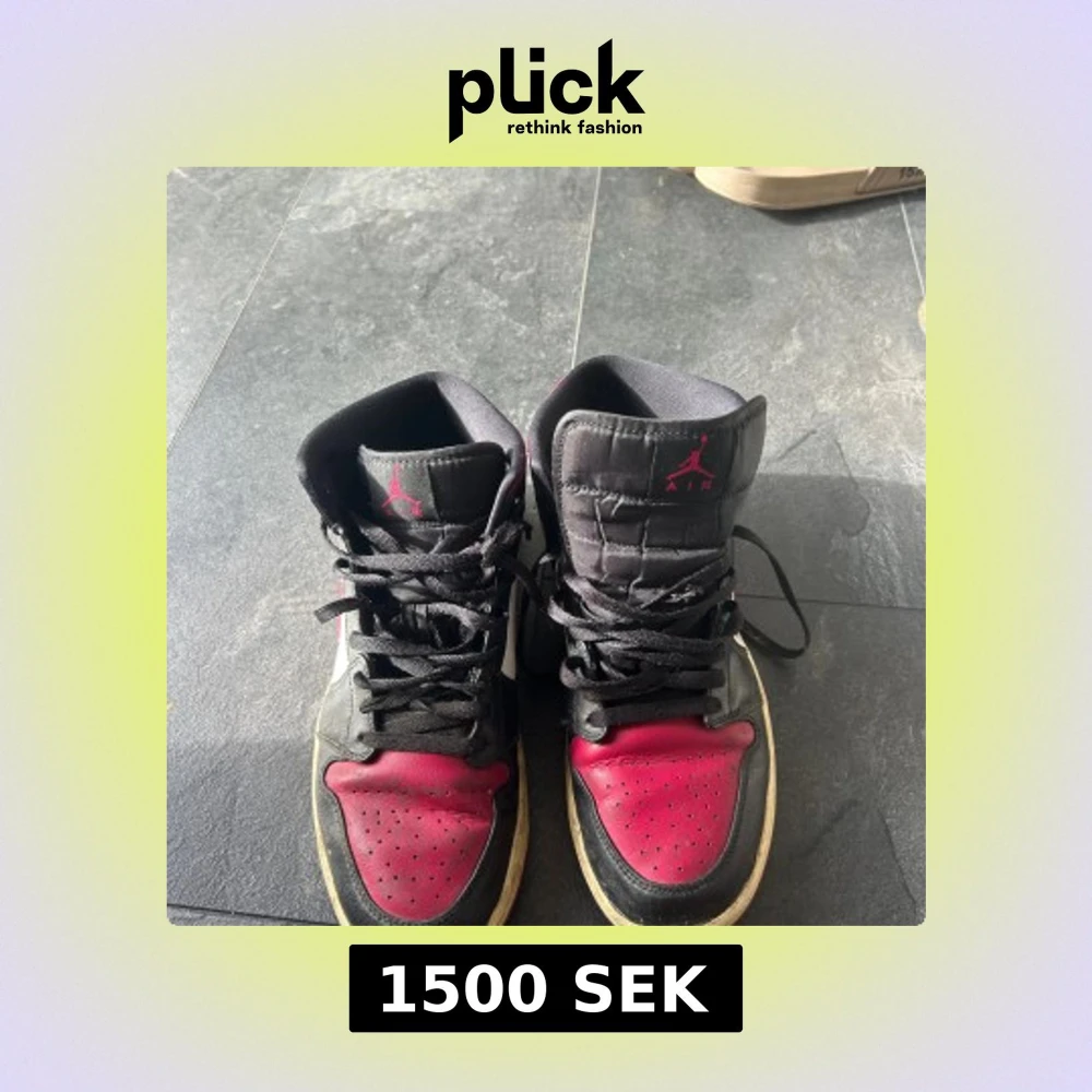 Säljer ett par Nike Air Jordan 1 sneakers i svart, rött och vitt. Klassisk mid-top modell med snörning, perforerad tå och ikonisk Jumpman-logga på plösen. Snygg kontrast mellan färgerna och den röda yttersulan ger en riktigt fet look. Perfekta för dig som gillar streetwear.