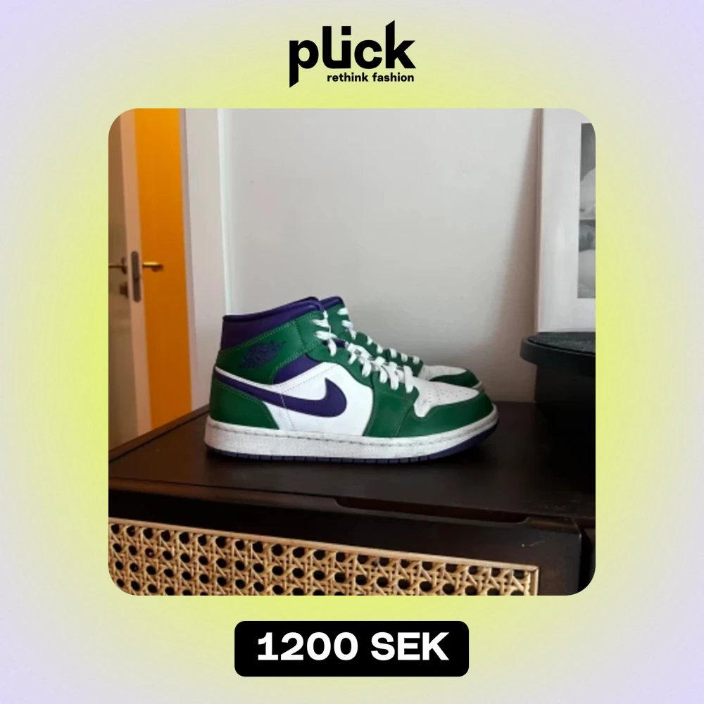 Säljer ett par Nike Air Jordan 1 Mid i färgerna grön och lila. Skorna är i gott skick och har använts fåtal gånger.