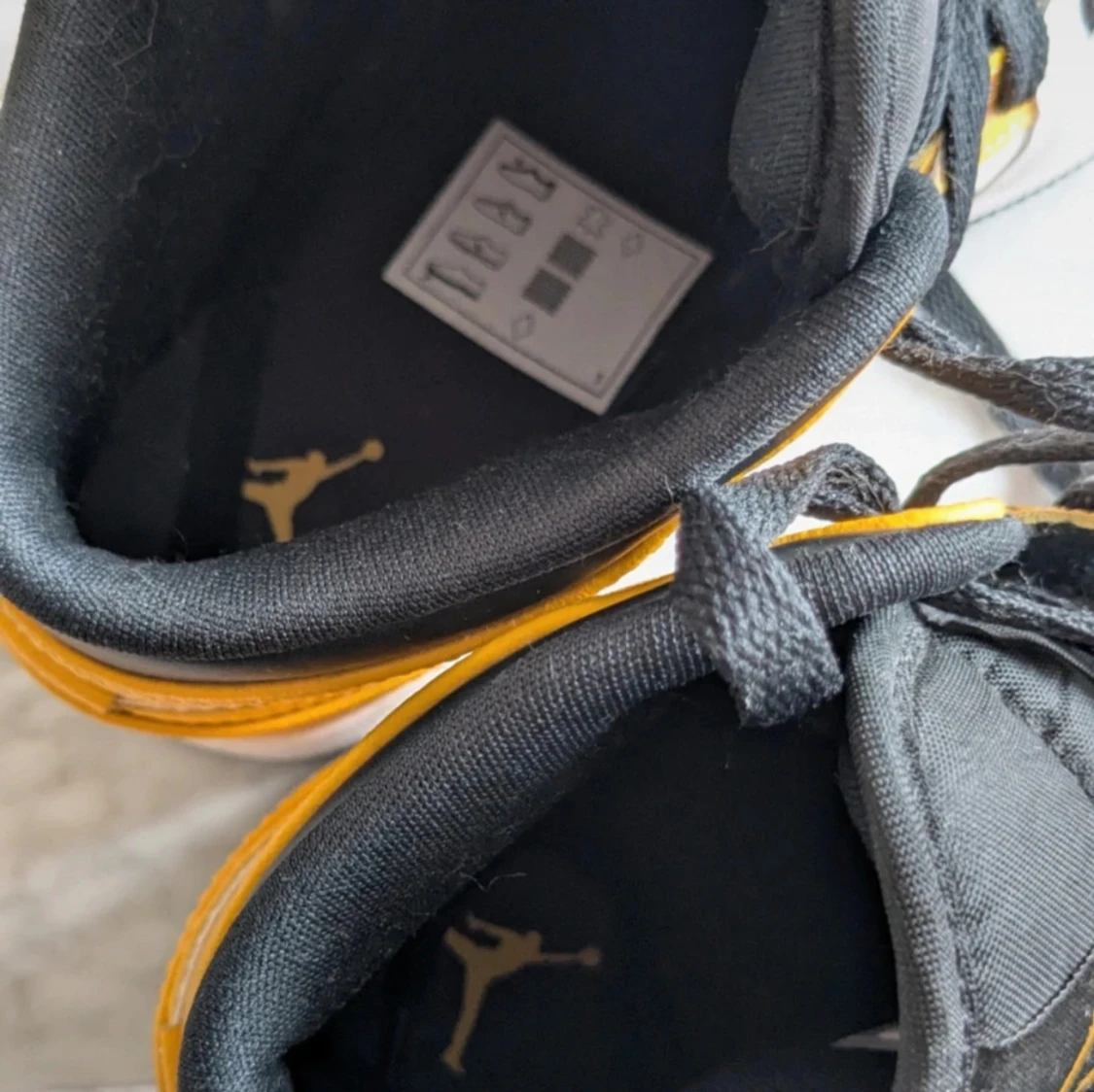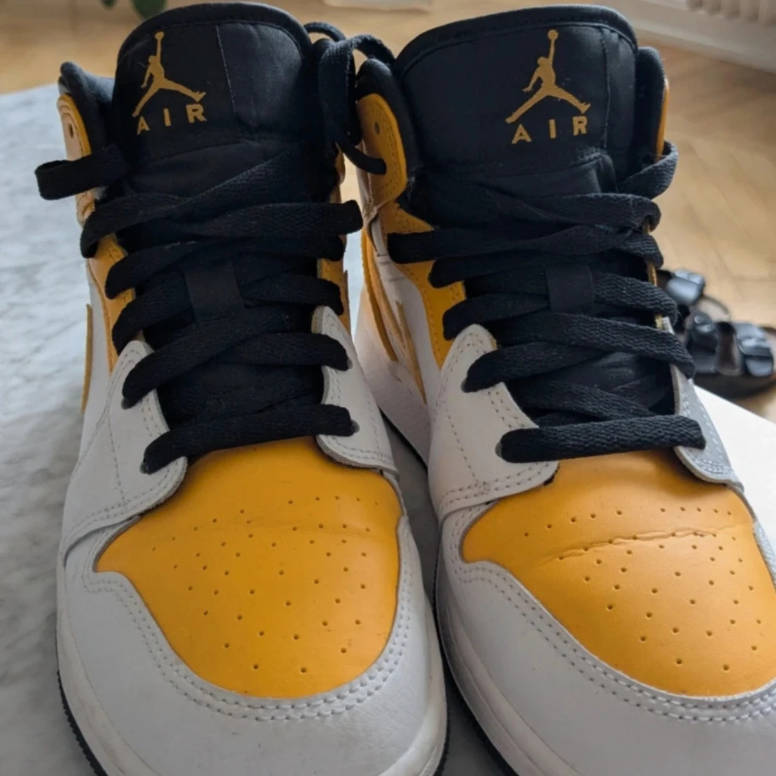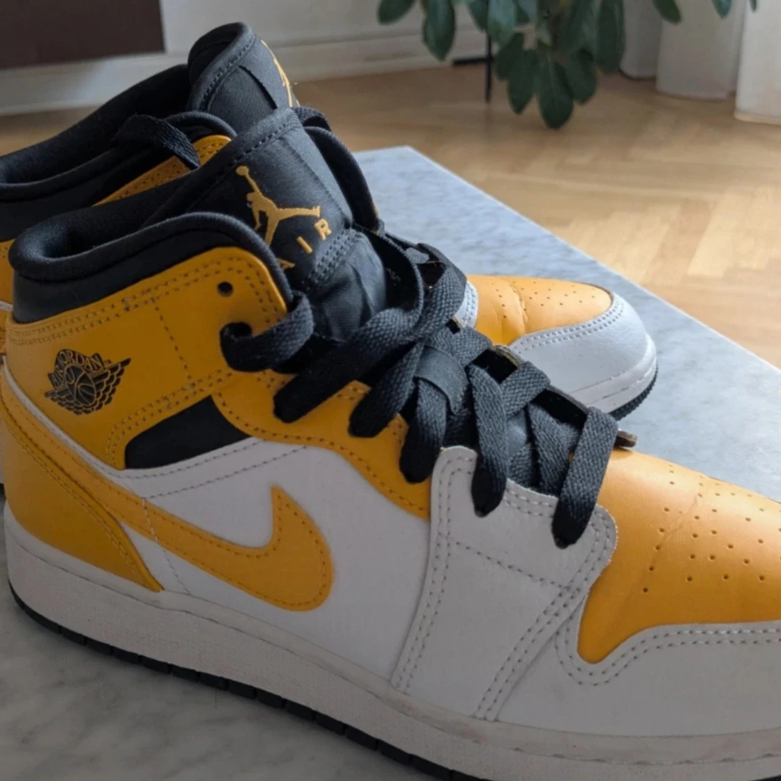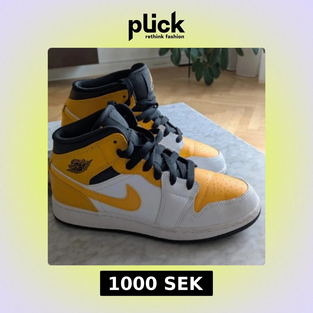 Säljer ett par Nike Air Jordan 1 Mid i en snygg gul, vit och svart färgkombination.