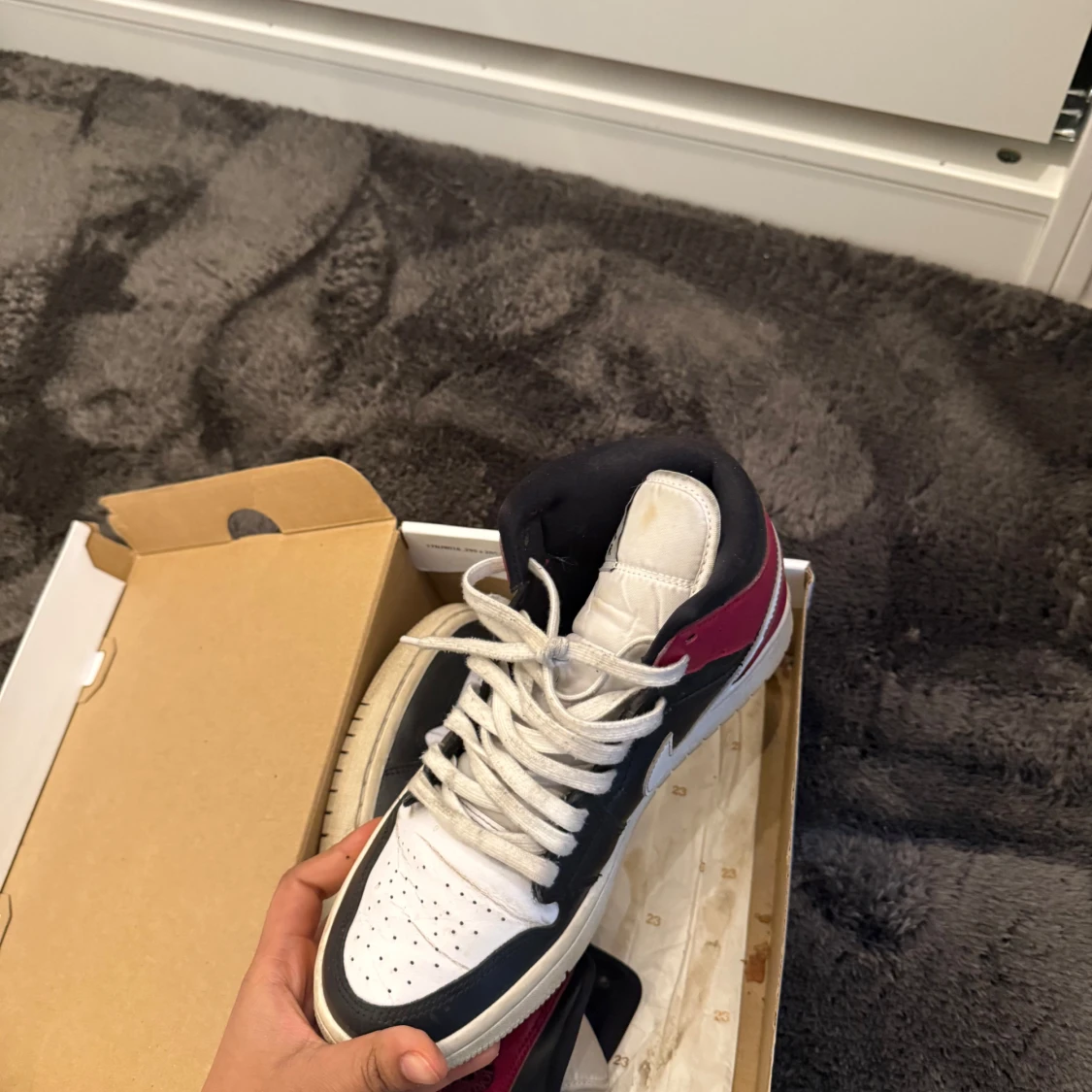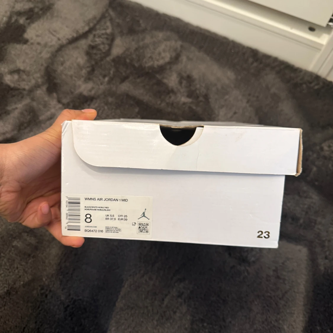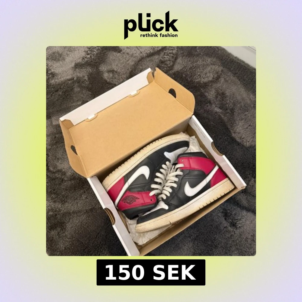 Säljer ett par Nike Air Jordan 1 Mid i svart, vitt och rött. Skorna har klassisk design med vit sula, svart ovandel och röda detaljer vid hälen. Ikonisk vinge-logga på sidan och vita snören. Perfekta för dig som gillar streetwear.