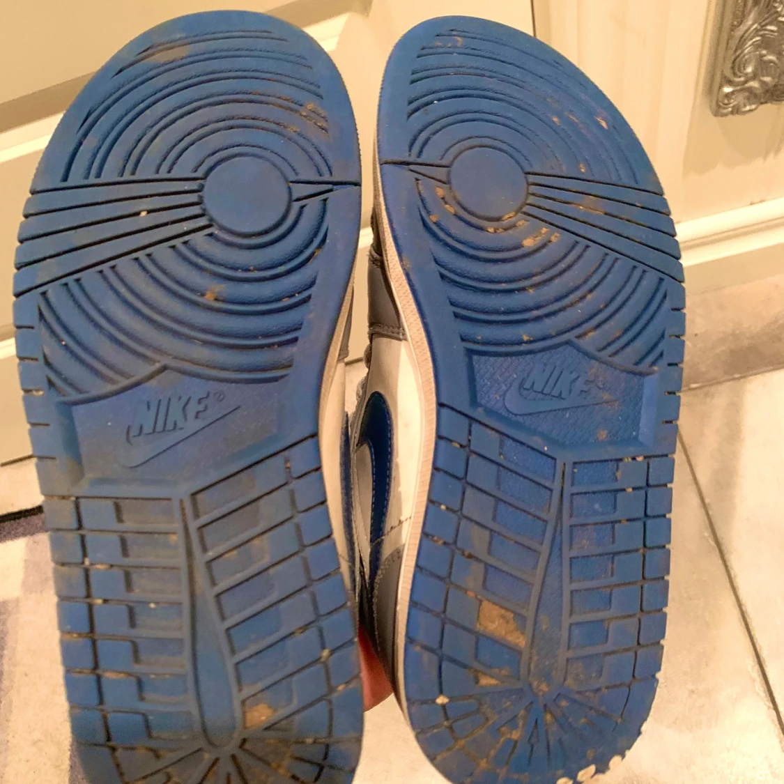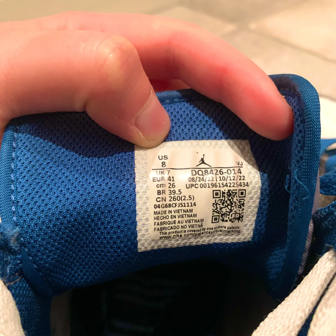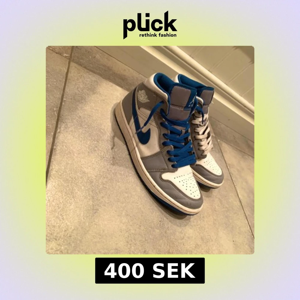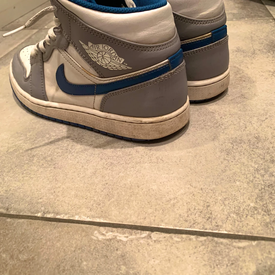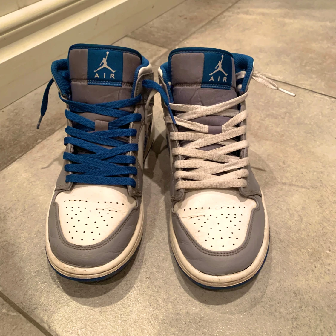 Säljer ett par Nike Air Jordan 1 Mid i grått, vitt och blått. Skorna har klassisk hög siluett, blå swoosh och olika färg på skosnörena – ett blått och ett vitt. Perfekta för dig som gillar streetwear och vill sticka ut.