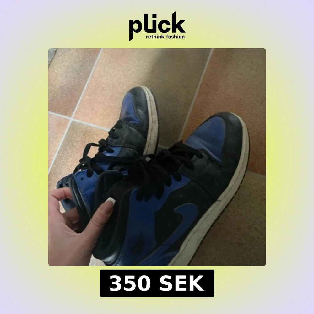 Säljer ett par Nike Air Jordan 1 Retro High OG sneakers i blått och svart med klassisk snörning och rund tå. Skorna har den ikoniska Air Jordan-loggan på sidan och är perfekta för dig som gillar streetwear och sneakers.