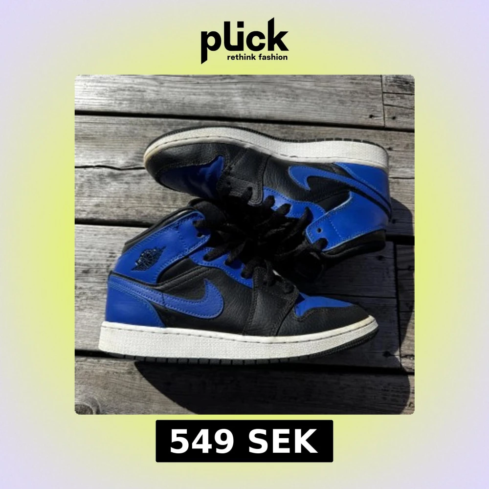 Säljer ett par Nike Air Jordan 1 sneakers i svart och blått skinn med klassisk vit sula. Skorna har svarta skosnören, rund tå och ikoniska Jordan-loggan på sidan. Perfekt för dig som vill sticka ut med en tidlös och sportig look.