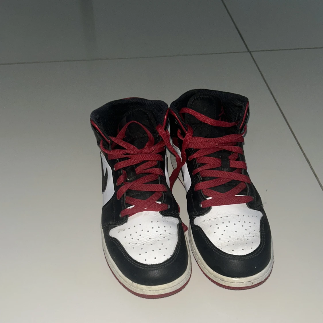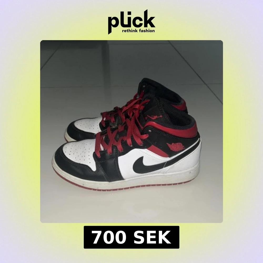 Säljer ett par Nike Air Jordan 1 sneakers i klassisk svart, röd och vit färg. Skorna har högt/mellan skaft, röda snören och ikoniska Jordan-loggor på sidan. Ovandelen är i skinn och syntet. Kommer med originalkartong. Storlek 39,original pris 1400.
