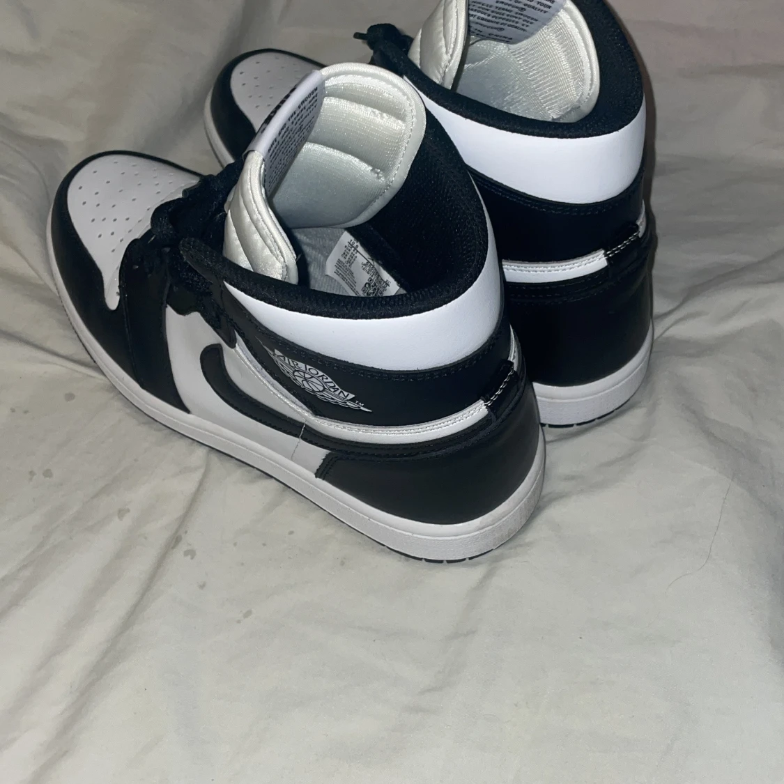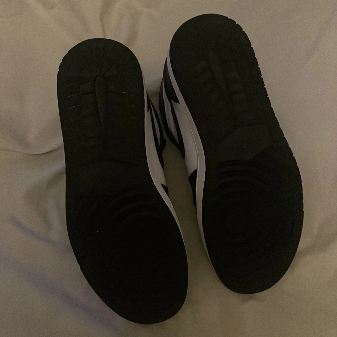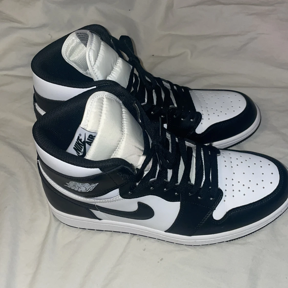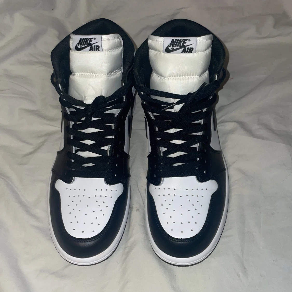 Säljer ett par Nike Air Jordan 1 sneakers i svart och vitt. Klassisk high-top modell med svart swoosh, perforerad tåbox och snörning. Skorna har en stilren kontrast mellan svart och vitt skinn, samt ikoniska Air Jordan-loggan på sidan. Perfekta för dig som gillar streetwear.