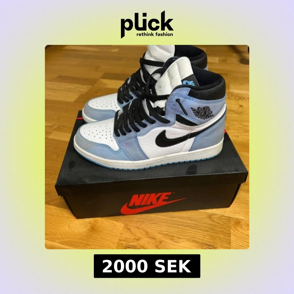 Nike Air Jordan 1 Retro High OG i färgen University Blue. Snygga high-top sneakers med vit och ljusblå ovandel i skinn och mocka, svarta detaljer och snörning. Ikonisk Jordan Wings-logga på sidan och svart Swoosh. Perfekt för dig som vill sticka ut med klassisk streetstyle. Kartongen till skorna ingår.