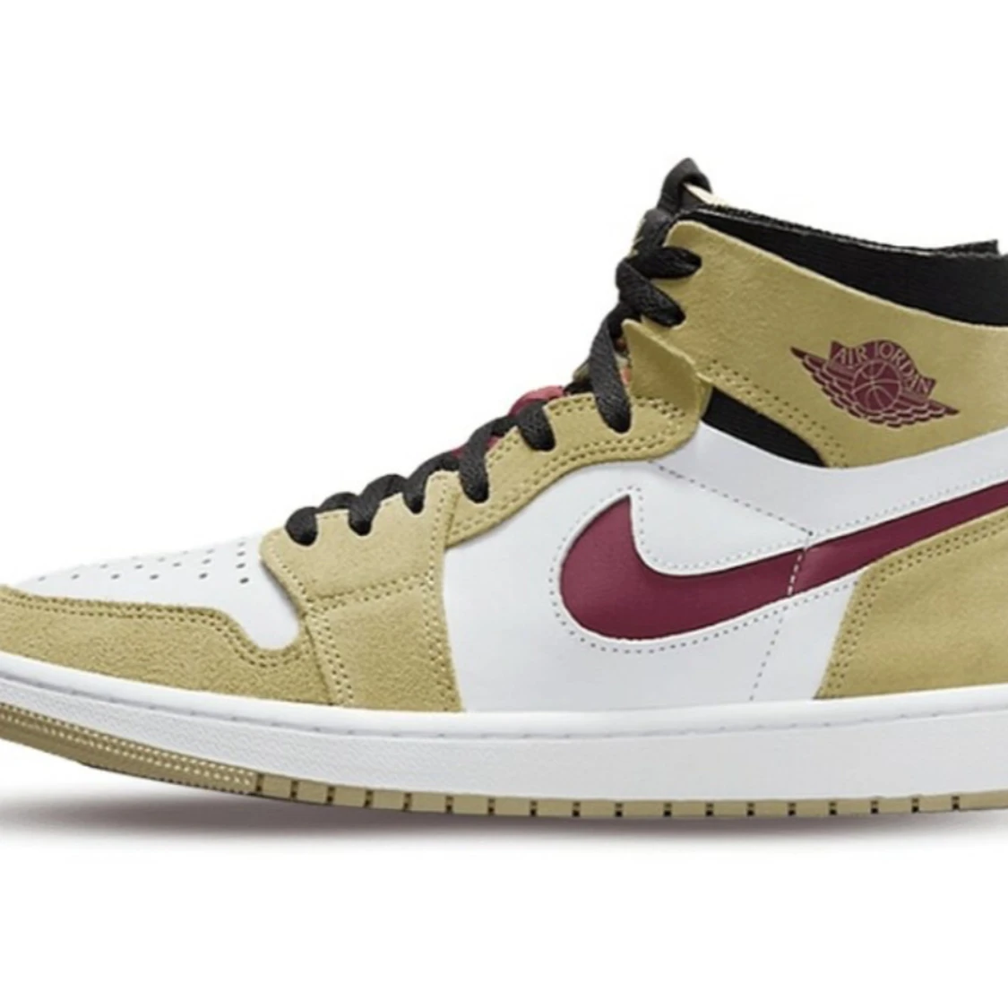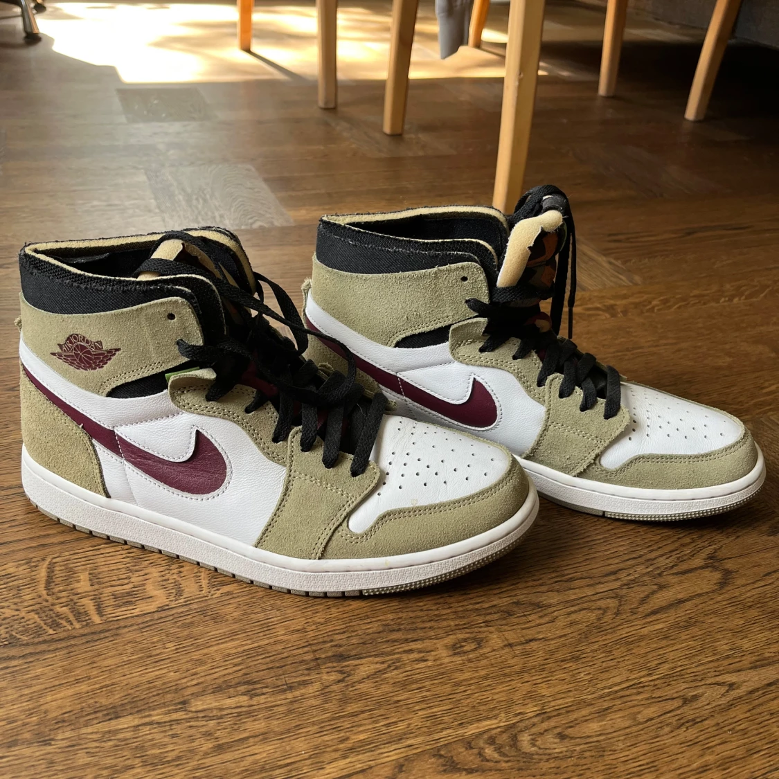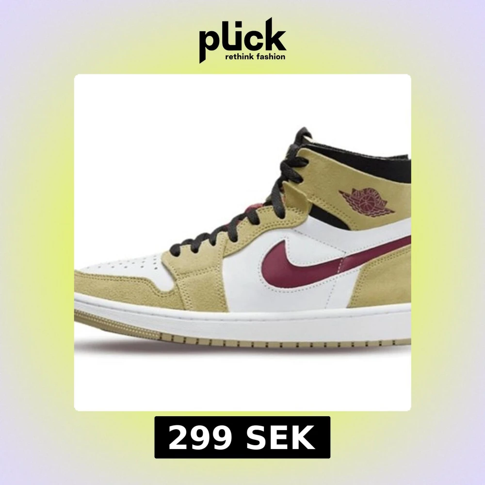 Nike Air Jordan 1 Zoom Air High med beige, vita och vinröda detaljer. Swoosh och Air Jordan-logga i vinrött, svart snörning och färgglad grafisk plös med grön Zoom Air-logga. Klassisk rund tå och hög siluett – perfekt för dig som vill sticka ut.