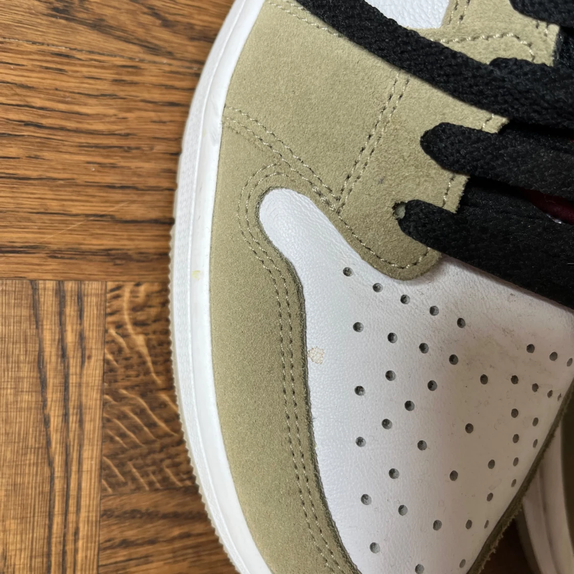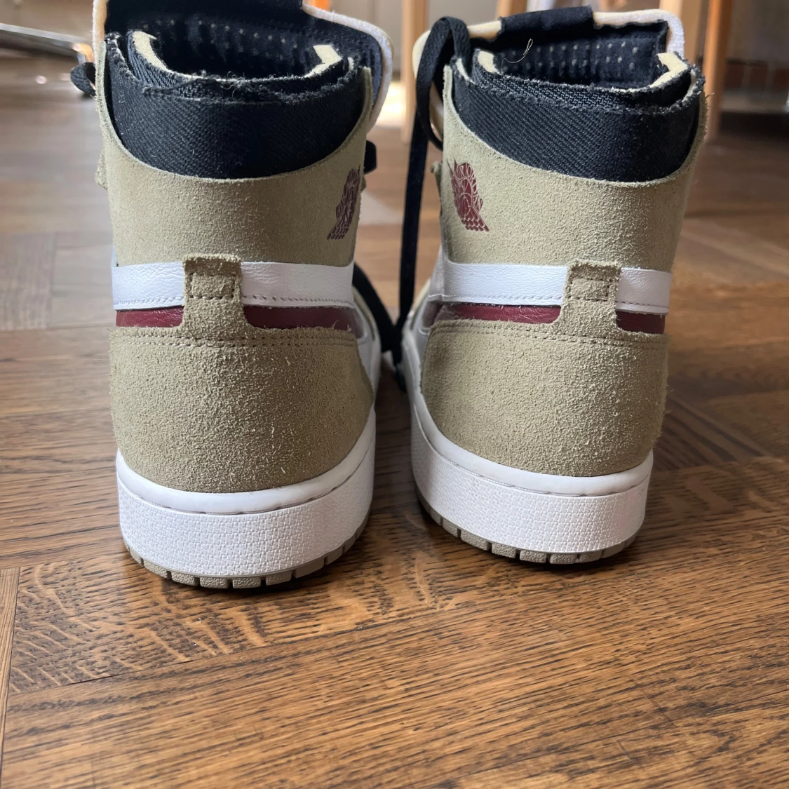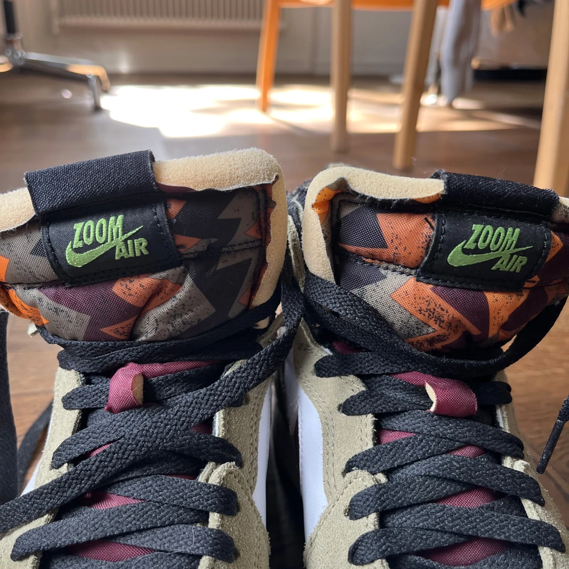 Nike Air Jordan 1 Zoom Air High med beige, vita och vinröda detaljer. Swoosh och Air Jordan-logga i vinrött, svart snörning och färgglad grafisk plös med grön Zoom Air-logga. Klassisk rund tå och hög siluett – perfekt för dig som vill sticka ut.