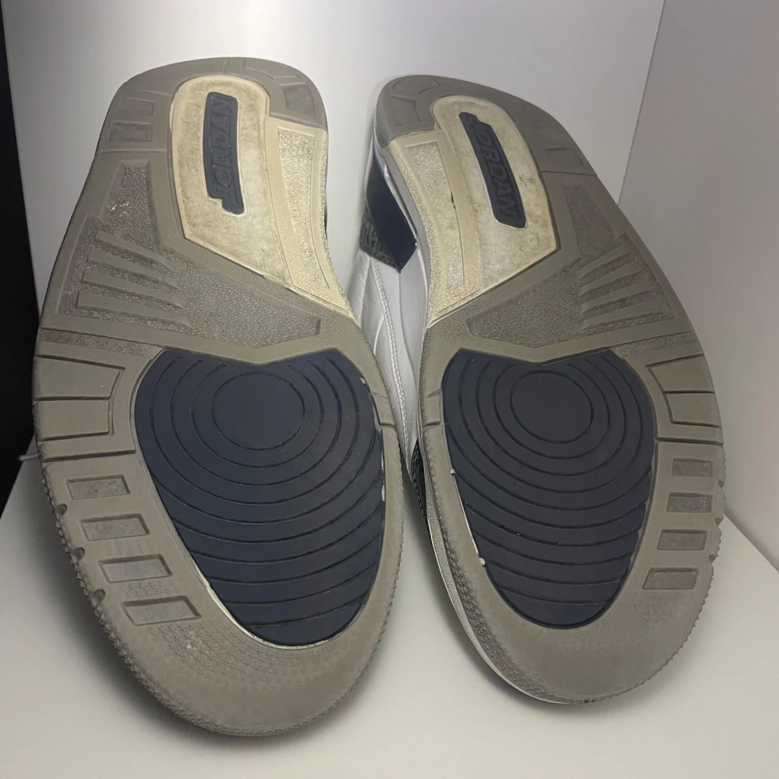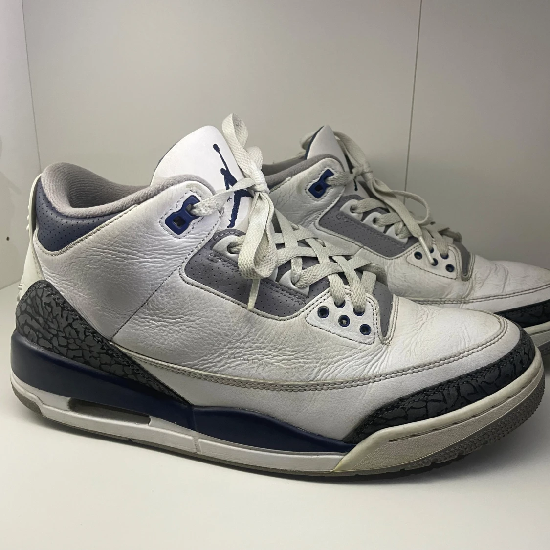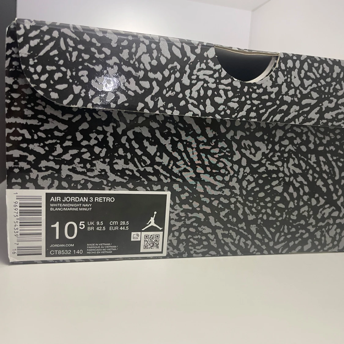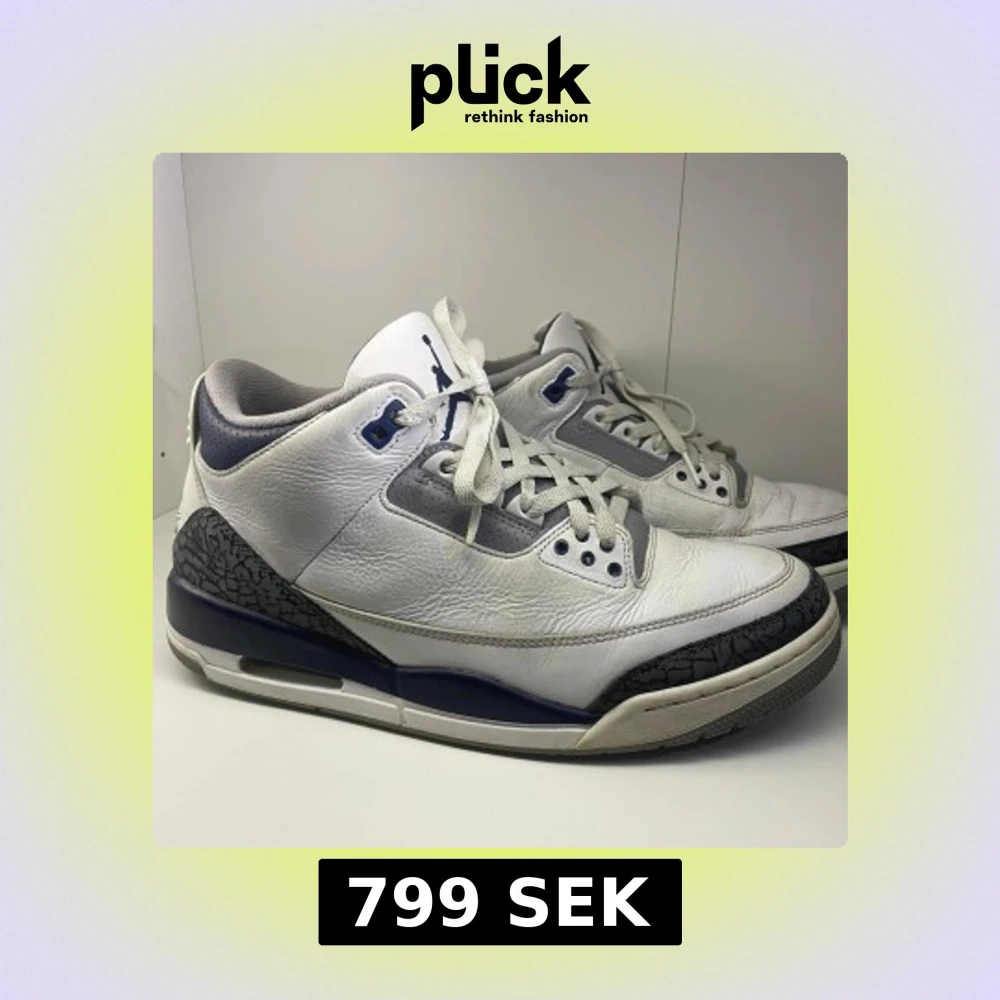 Nike Air Jordan 3 Retro i vitt och marinblått med elefantmönstrade detaljer på häl och tå. Ovandelen är i skinn och insidan är fodrad i blå textil. Perfekt för dig som gillar klassiska sneakers med streetkänsla. Jag säljer dessa nu då jag ej har användning för dem längre då de mest står i garderoben och samlar dam. De är väl använda och har lite slit märken här och där. Original lådan finns kvar men priset är lägre med tanke på skicket på skorna.