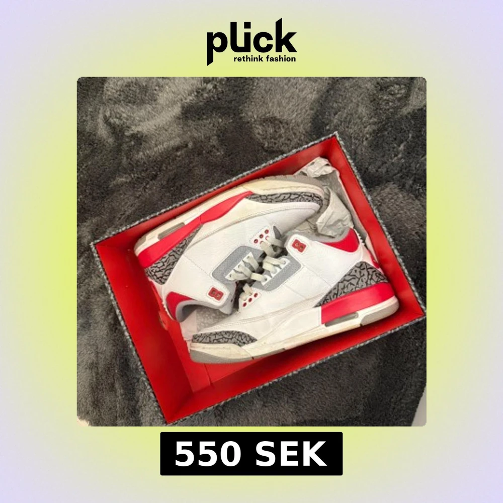 Säljer ett par Nike Air Jordan 3 Retro i vitt med röda och grå detaljer. Skorna har klassisk siluett, snörning och ikoniskt elefantmönster på tån och hälen. Perfekta för dig som gillar streetwear och sneakers med attityd.