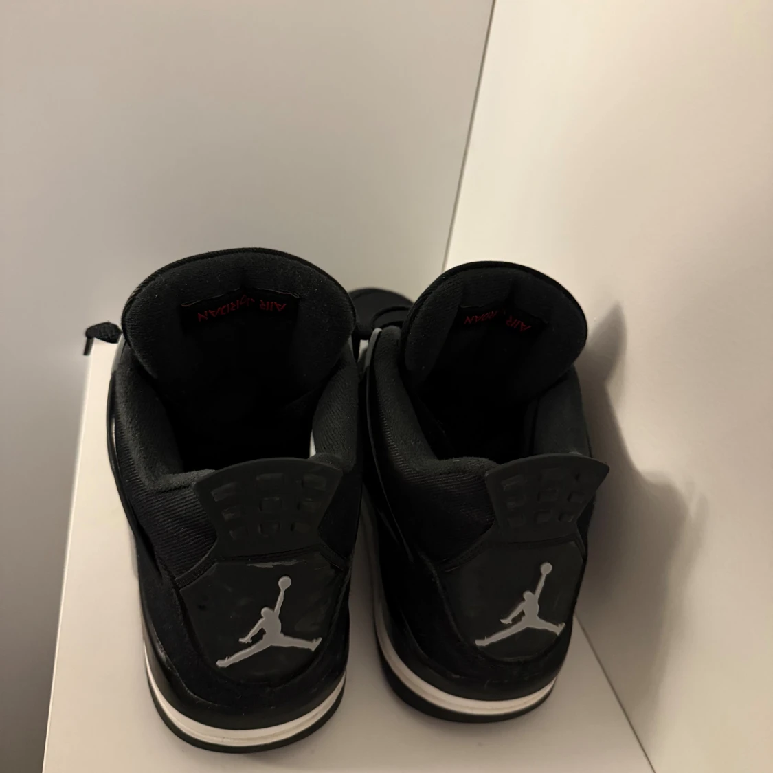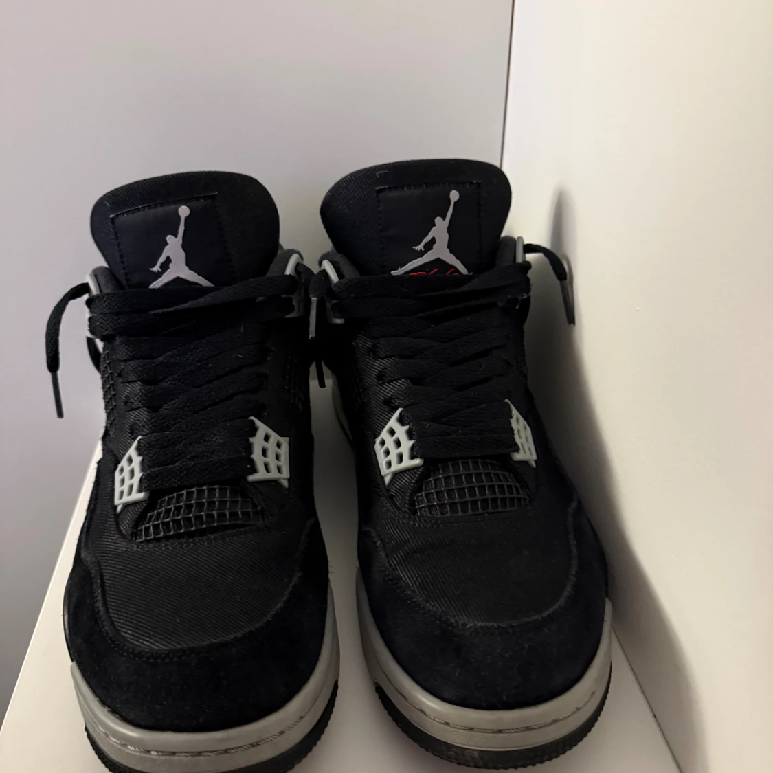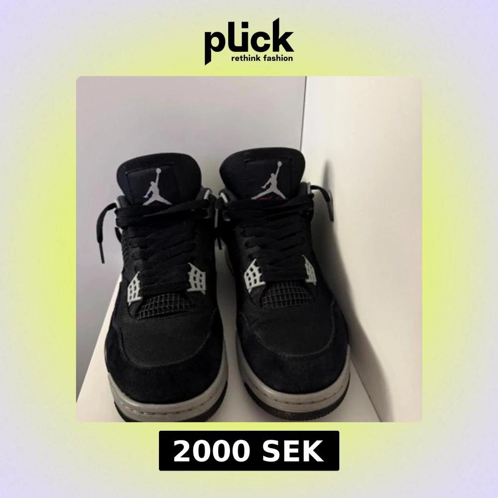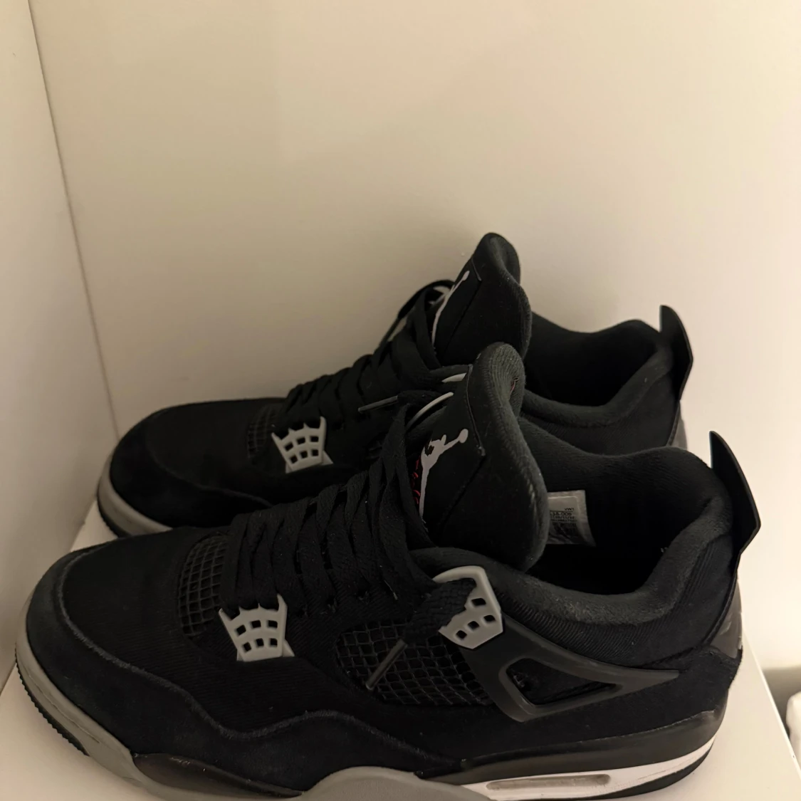 Säljer ett par svarta Nike Air Jordan 4 black canvas med grå och vita detaljer. Skorna har klassisk Jumpman-logga, snörning och meshpaneler på sidorna. Ovandelen är i mocka och syntet, sulan är grå med svart yttersula. Perfekta för dig som gillar streetwear. Köpt hos soleplus.