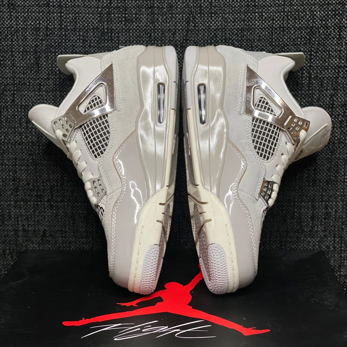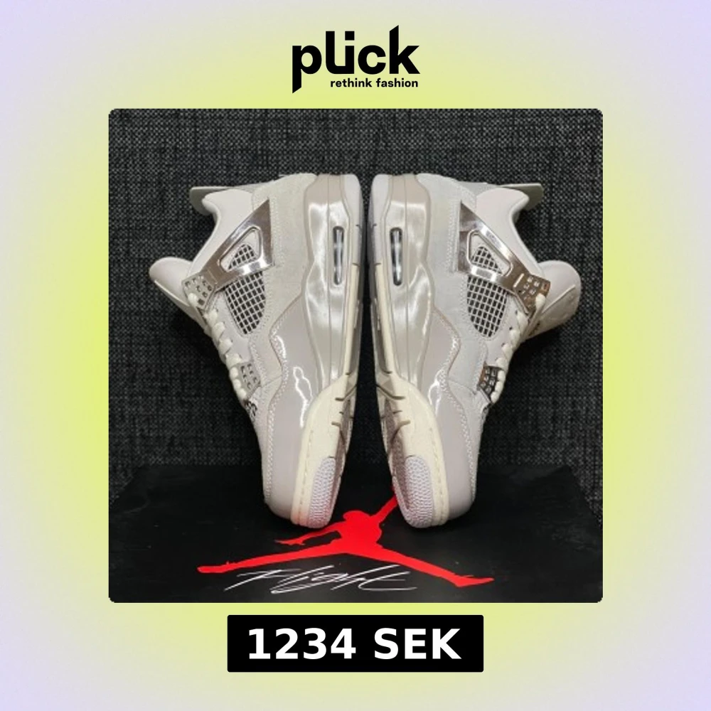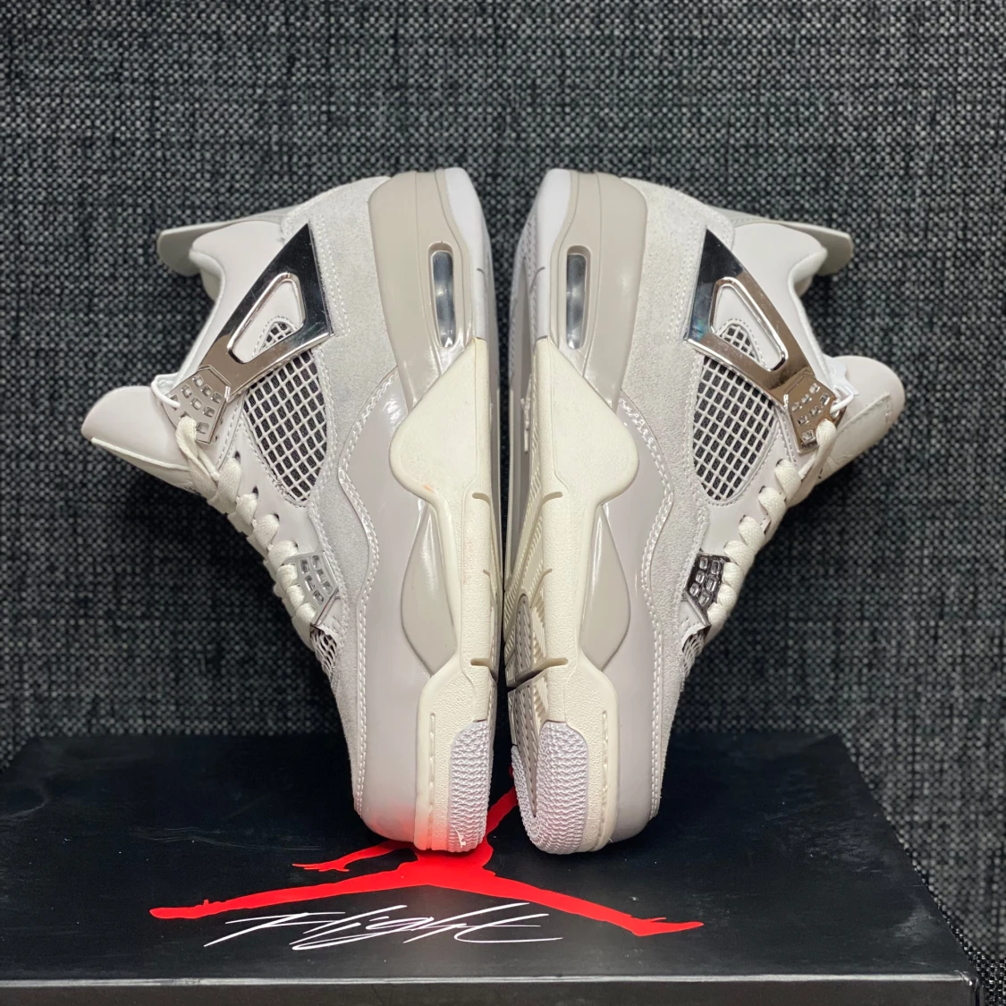 Nike Air Jordan 4 i en clean beige och silverfärg med metallic-detaljer. Ovandelen kombinerar skinn och mocka med meshpaneler och silvriga accenter på snörningen. Klassisk Air-dämpad sula och ikonisk Jumpman-logga på undersidan. Perfekt för dig som vill sticka ut.