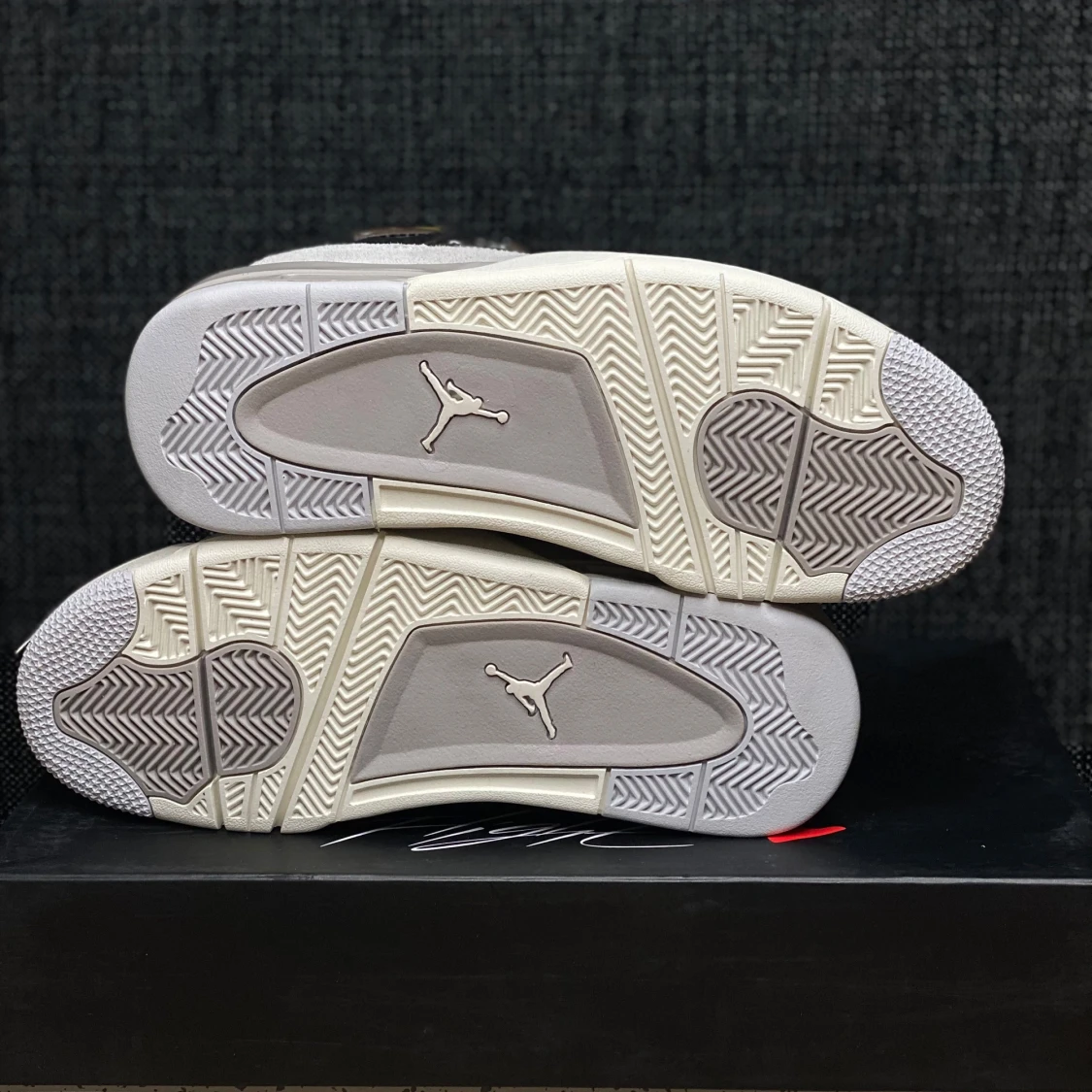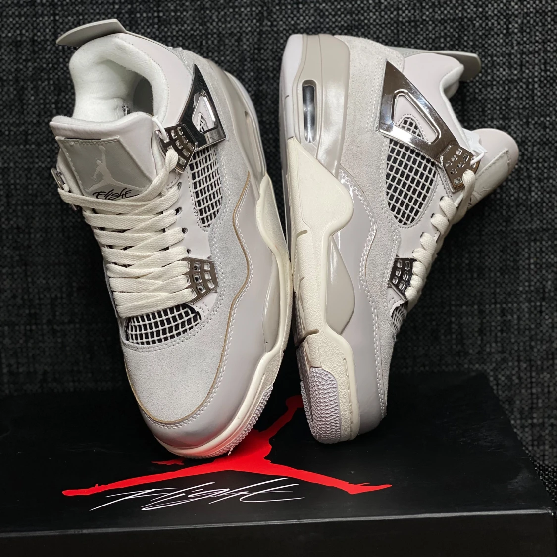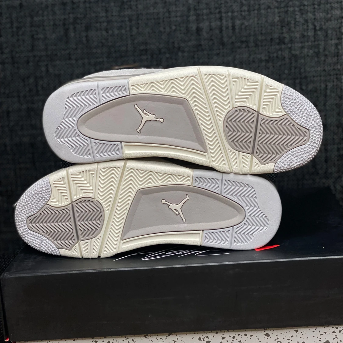 Nike Air Jordan 4 i en clean beige och silverfärg med metallic-detaljer. Ovandelen kombinerar skinn och mocka med meshpaneler och silvriga accenter på snörningen. Klassisk Air-dämpad sula och ikonisk Jumpman-logga på undersidan. Perfekt för dig som vill sticka ut.
