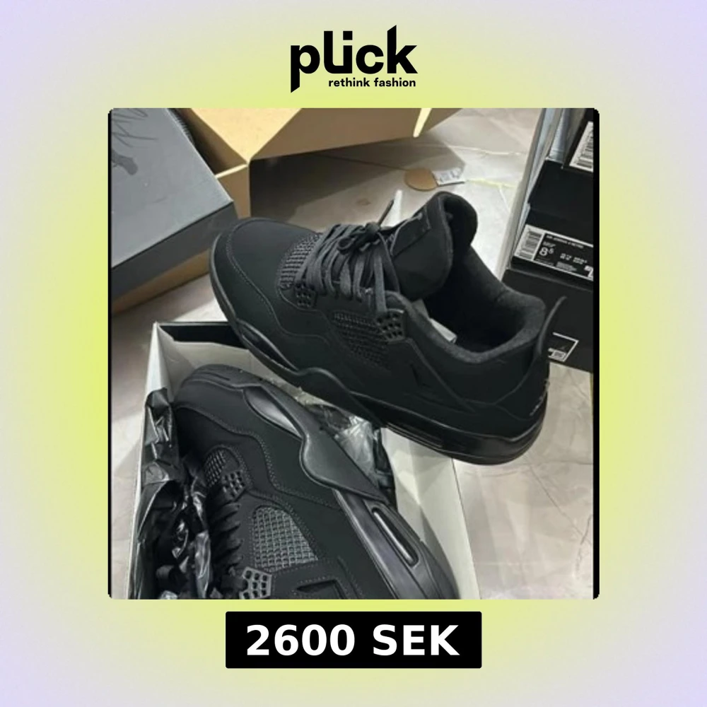 Säljer ett par helsvarta Nike Air Jordan 4 Retro sneakers. Skorna har en snygg och chunky siluett med meshdetaljer, snörning och ikoniska plastdetaljer på sidorna. Ovandelen är i mocka och syntet, och sulan är rejäl med synlig Air-enhet. Perfekta för dig som gillar streetwear.