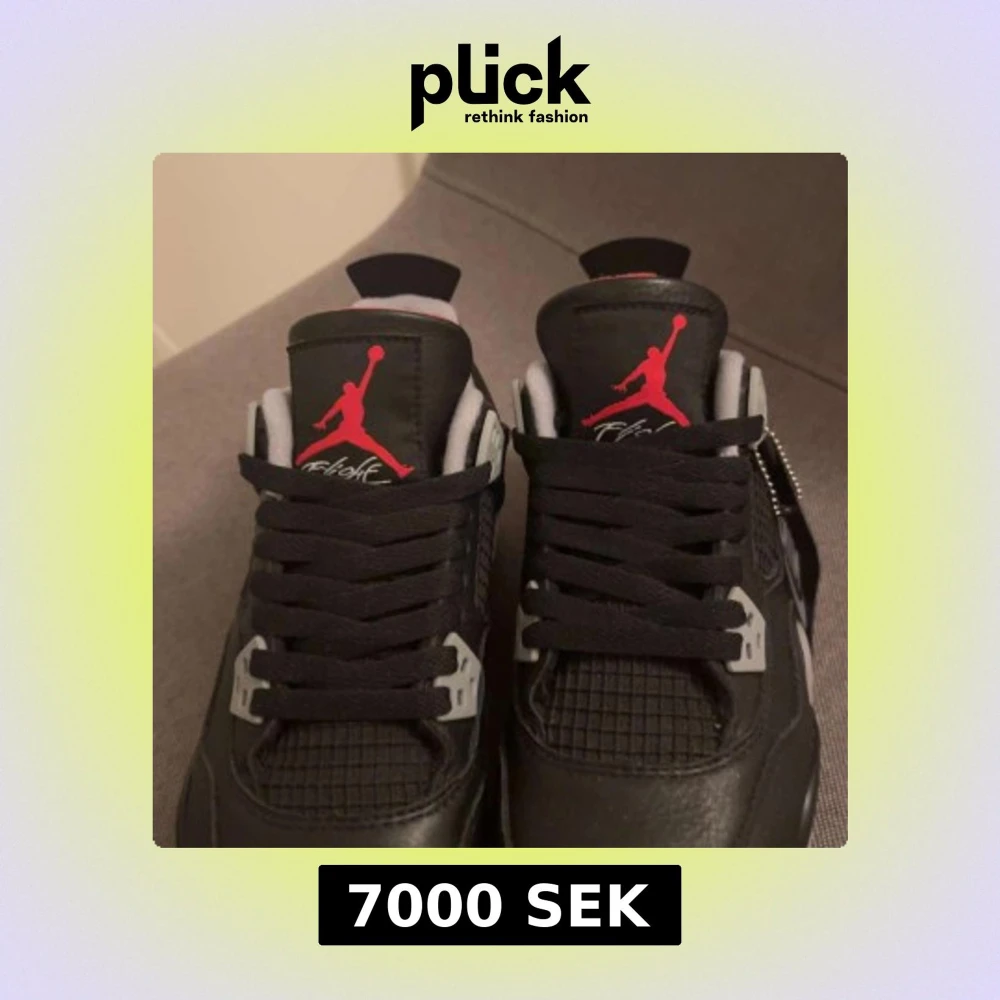Säljer ett par Nike Air Jordan 4 Retro i svart med röda och grå detaljer. Skorna har klassisk snörning, meshpaneler och tydlig Jumpman-logga på plösen. De är äkta nypris va ungefär 10 000kr och de är äkta. Skorna är helt oanvända då jag fick dom i present och de är tyvärr försmå