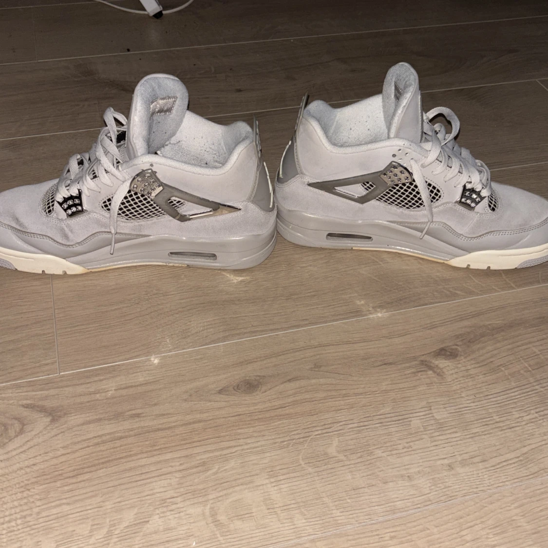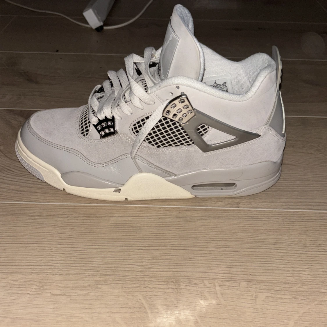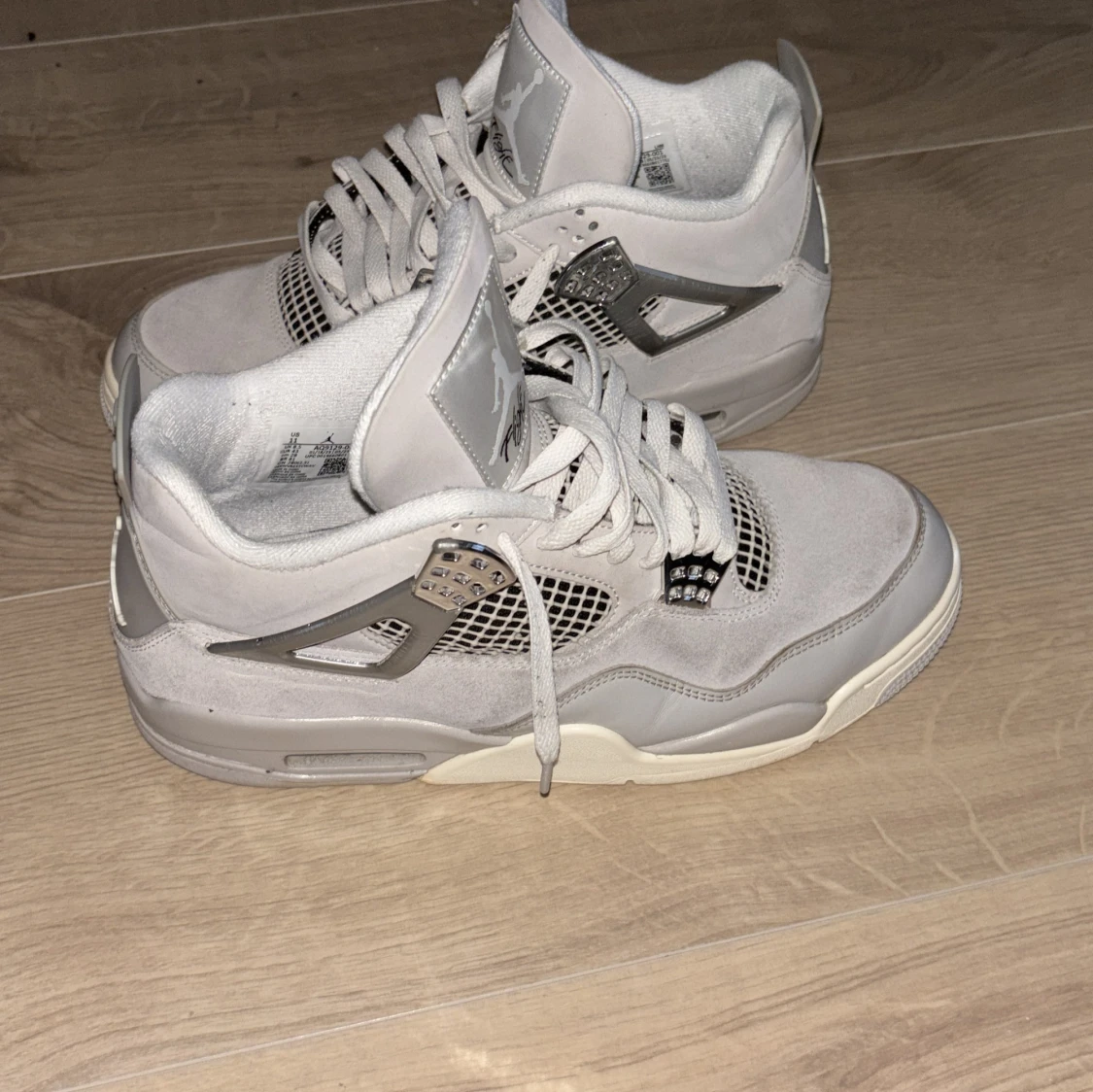 Säljer ett par Nike Air Jordan 4 Retro Frozen Moments. Skorna har en snygg mix av mocka och syntet, med silverdetaljer och meshpaneler på sidorna. Klassisk snörning och ikonisk Jumpman-logga på hälen. Perfekta för dig som gillar streetwear och sneakers med stil.