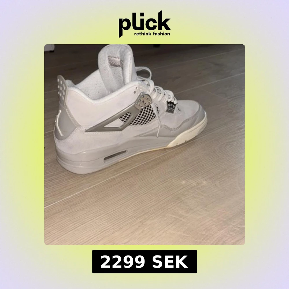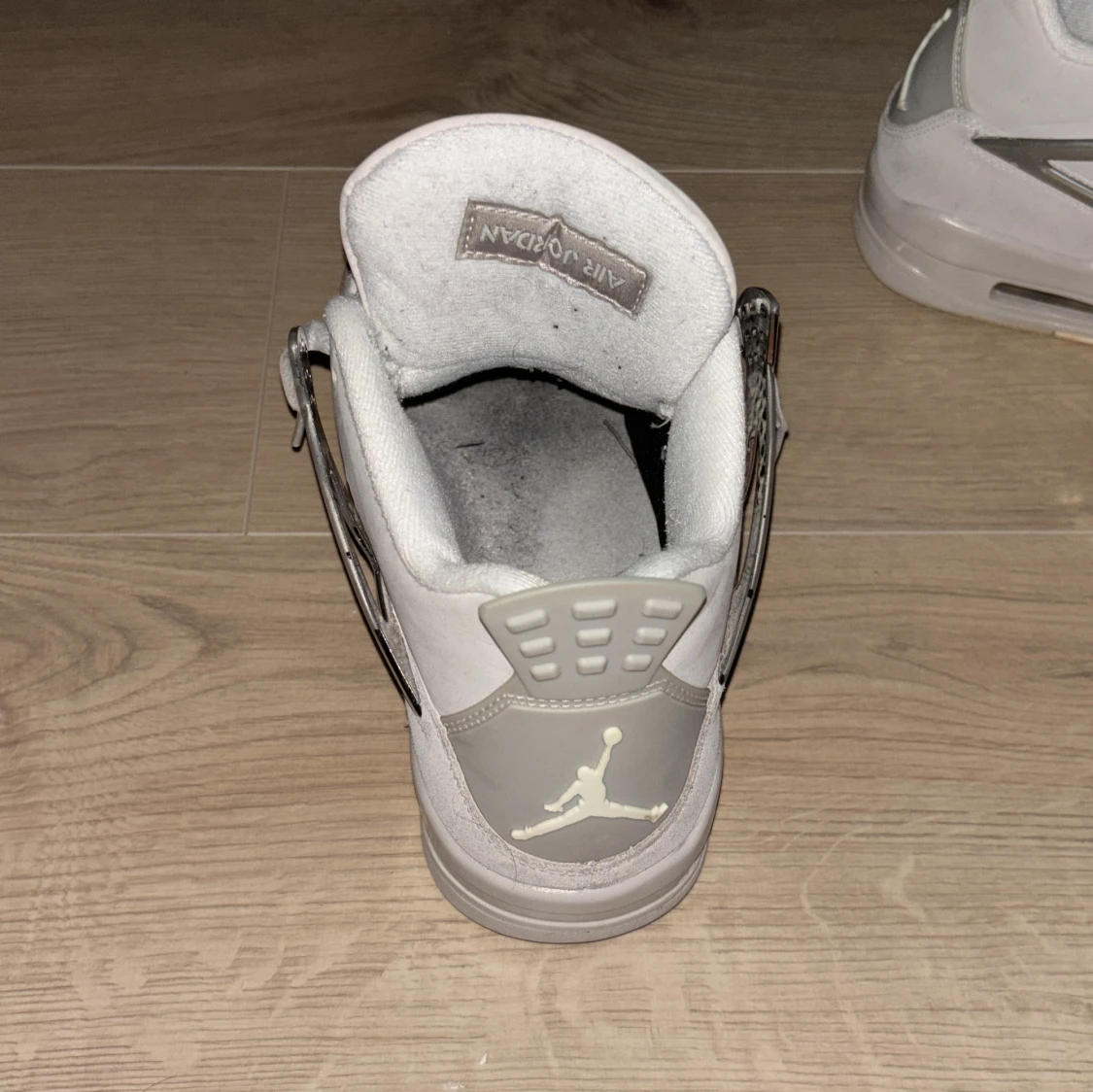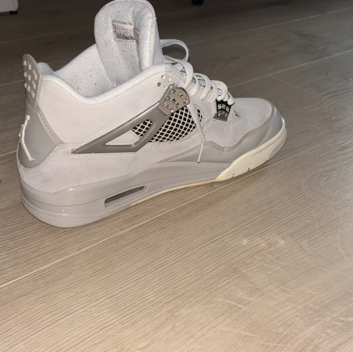 Säljer ett par Nike Air Jordan 4 Retro Frozen Moments. Skorna har en snygg mix av mocka och syntet, med silverdetaljer och meshpaneler på sidorna. Klassisk snörning och ikonisk Jumpman-logga på hälen. Perfekta för dig som gillar streetwear och sneakers med stil.