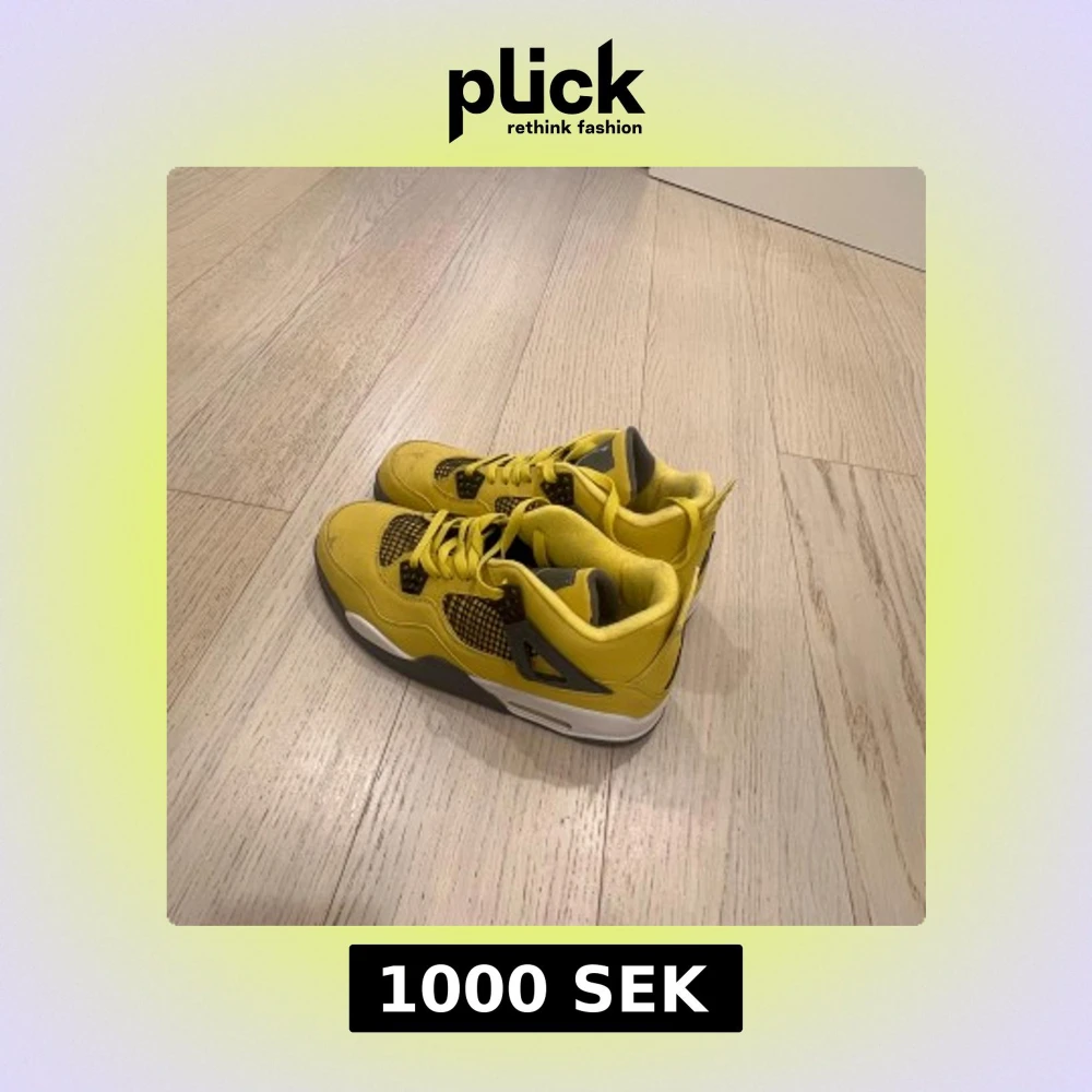 Nike Air Jordan 4 Retro Lightning i en riktigt fet gul färg med svarta och vita detaljer i storlek 43. Nypris ligger på ca 4000 men är inte helt säker på hur äkta de är därav priset. Rengör och städar dem innan jag skickar.
