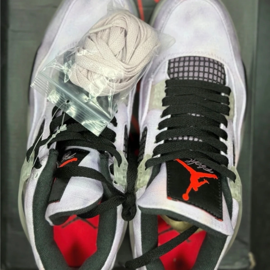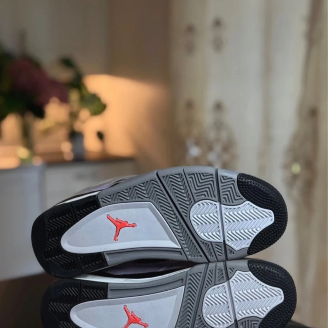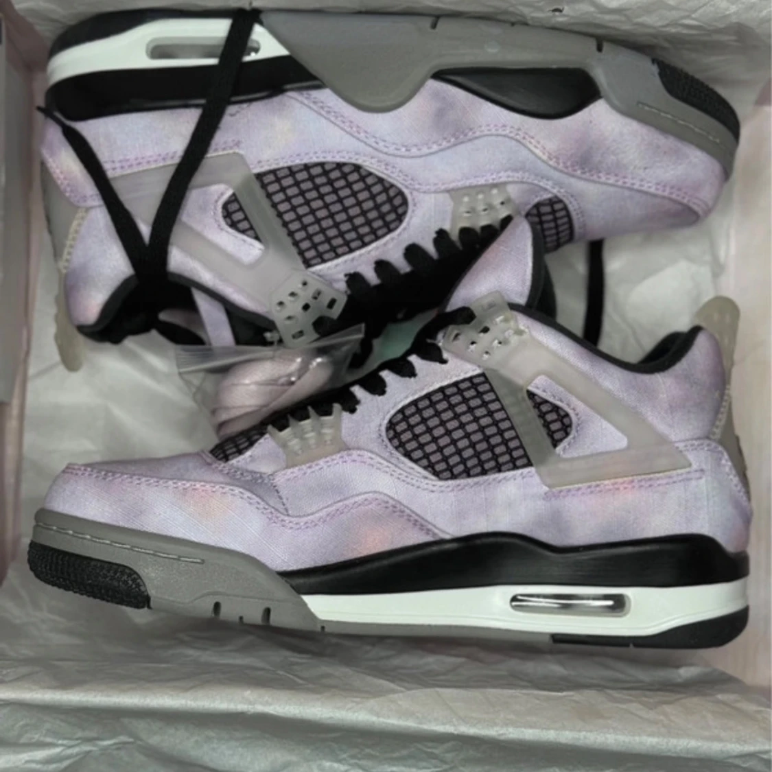 Nike Air Jordan 4 Retro sneakers i en unik ljuslila färg med svarta och grå detaljer. Skorna har meshpaneler, svarta snören och den klassiska röda Jumpman-loggan på plösen och sulan. Ovandelen är i textil och syntet, med robust sula och extra snörhål för personlig stil.