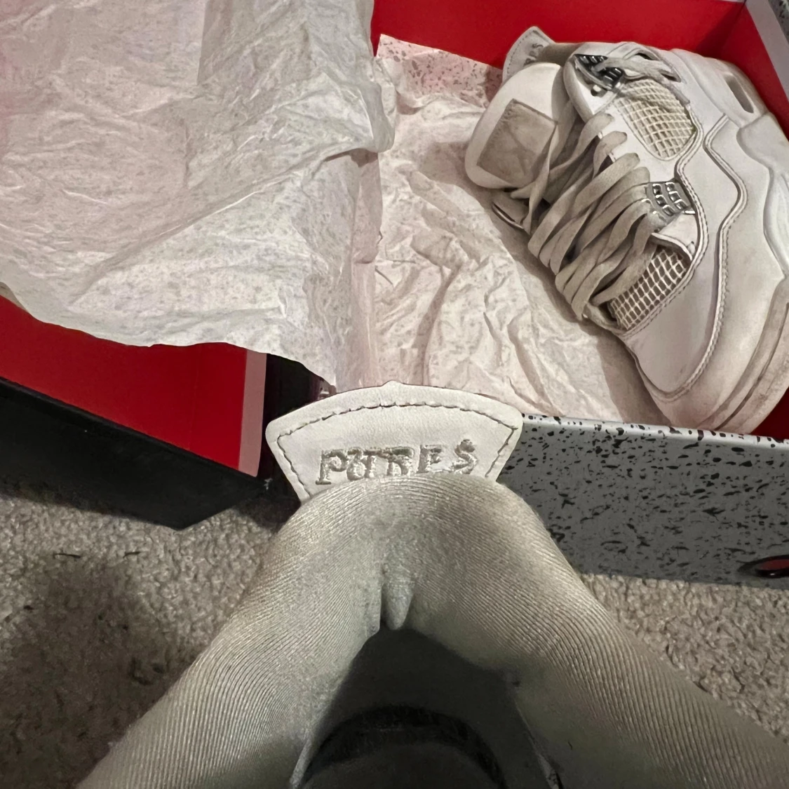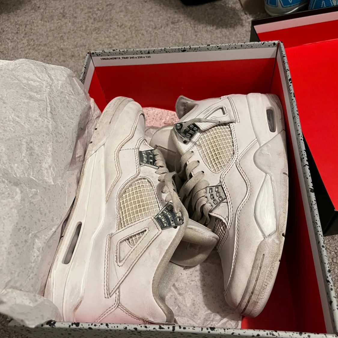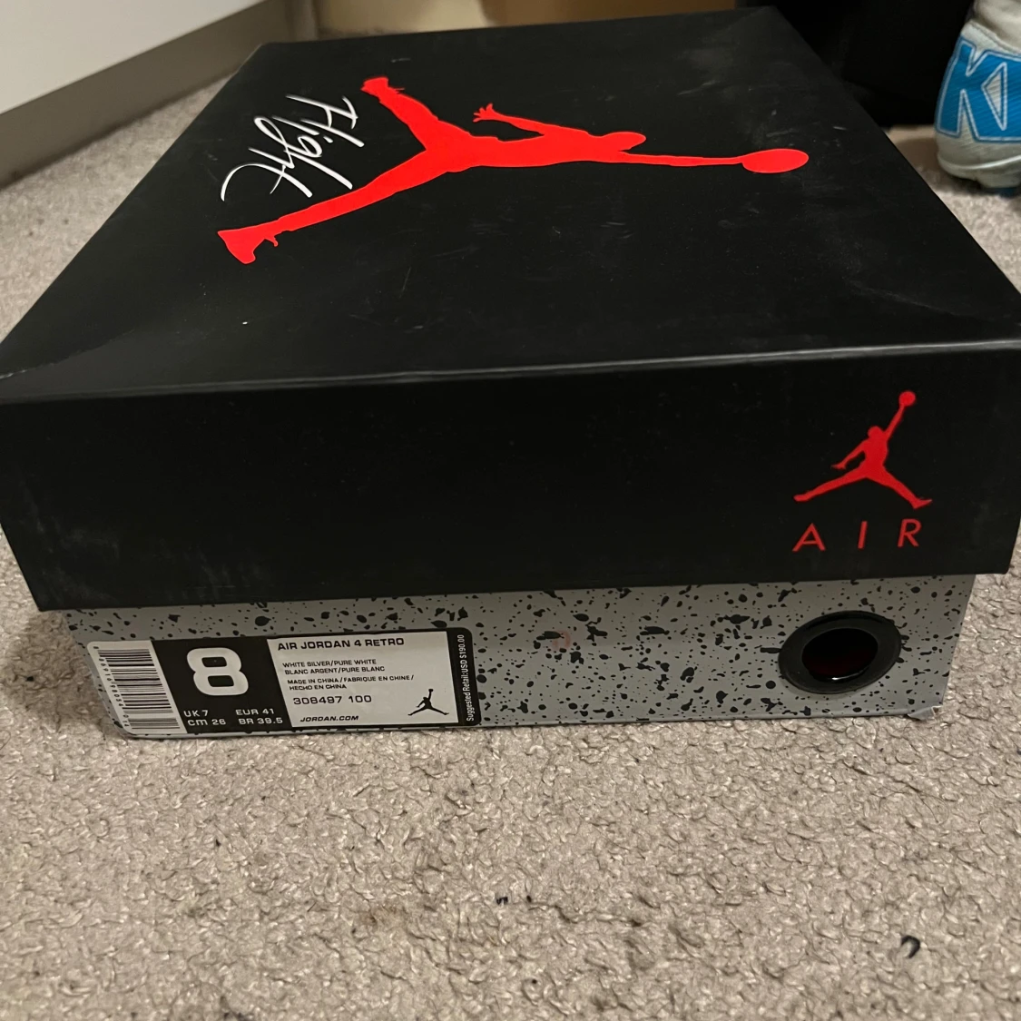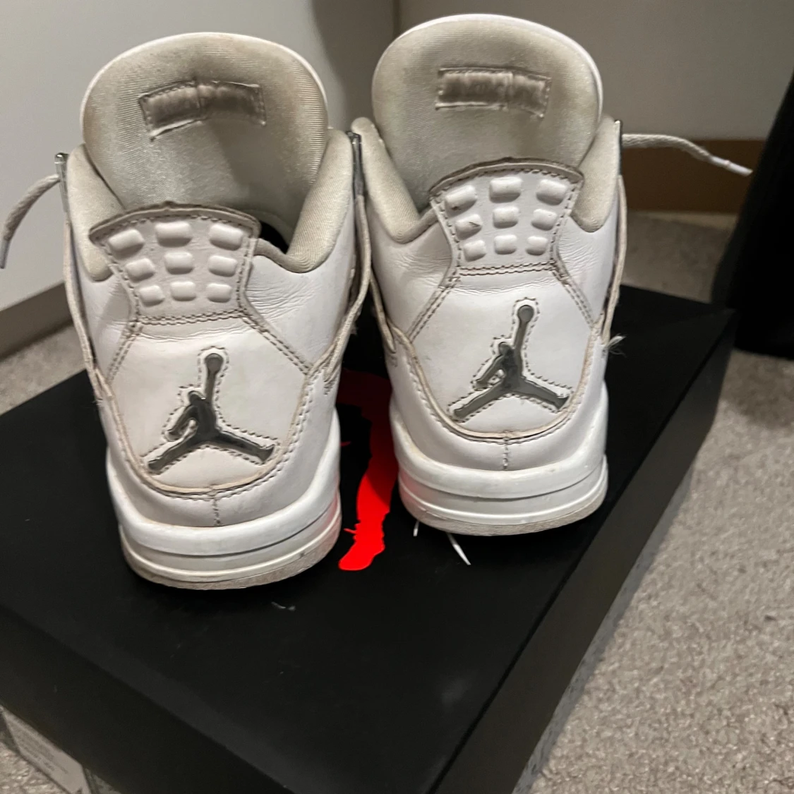 Säljer ett par Nike Air Jordan 4 Retro pure money i helvitt skinn med meshpaneler och coola metalliska detaljer vid snörningen. Klassisk Jumpman-logga på hälen och platt sula. Perfekta för dig som gillar streetstyle och vill sticka ut med en ikonisk sneaker.