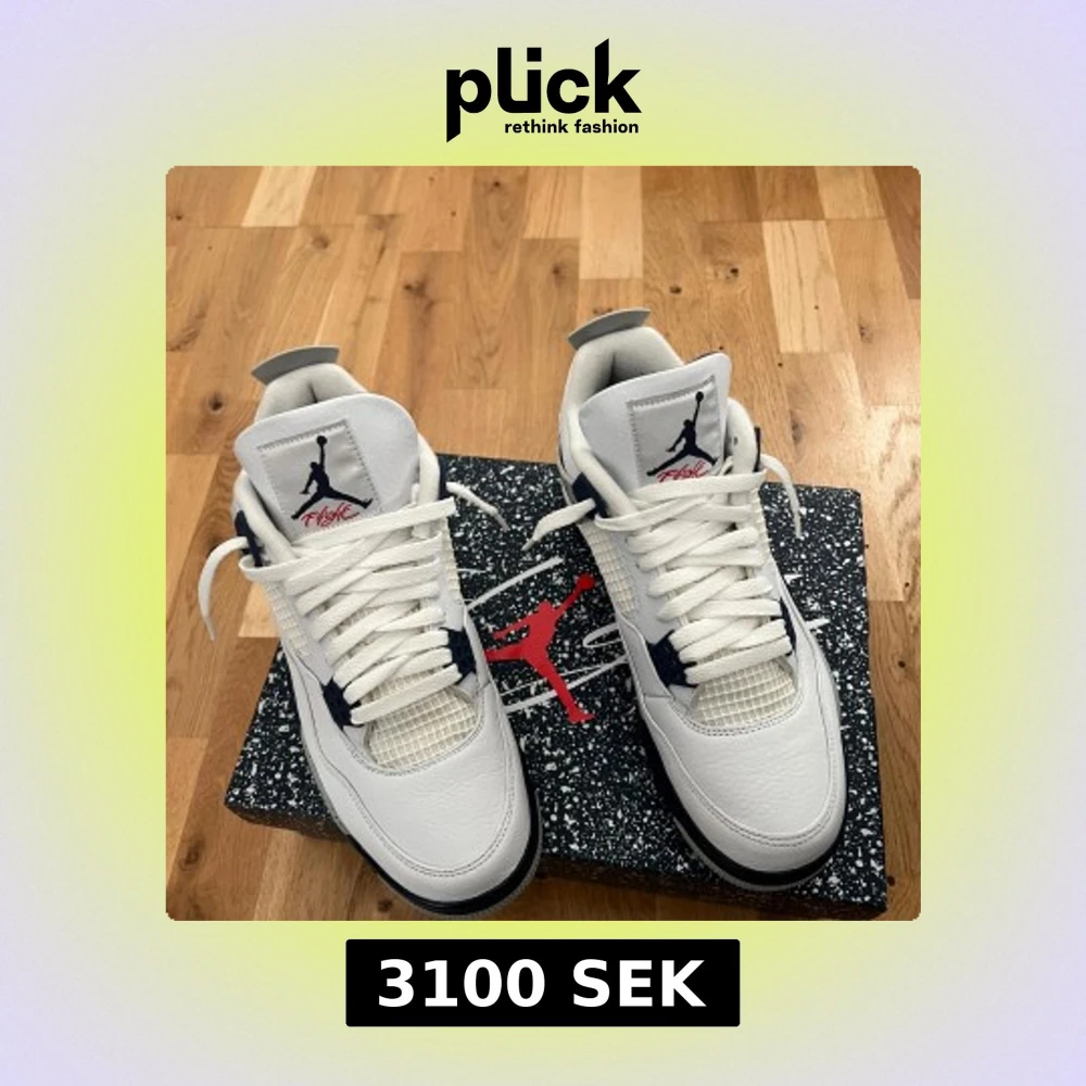 Nike Air Jordan 4 Retro i färgen White/Midnight Navy. Klassiska sneakers med vit ovandel i skinn, grå och marinblå detaljer samt stänkmönstrad mellansula. Ikonisk Jumpman-logga på plösen och hälen. Snygg siluett med snörning och meshpaneler för extra stil. Har även använt skydd till sulan och behandlat skon väl, är även öppen för andra förslag till pris.
