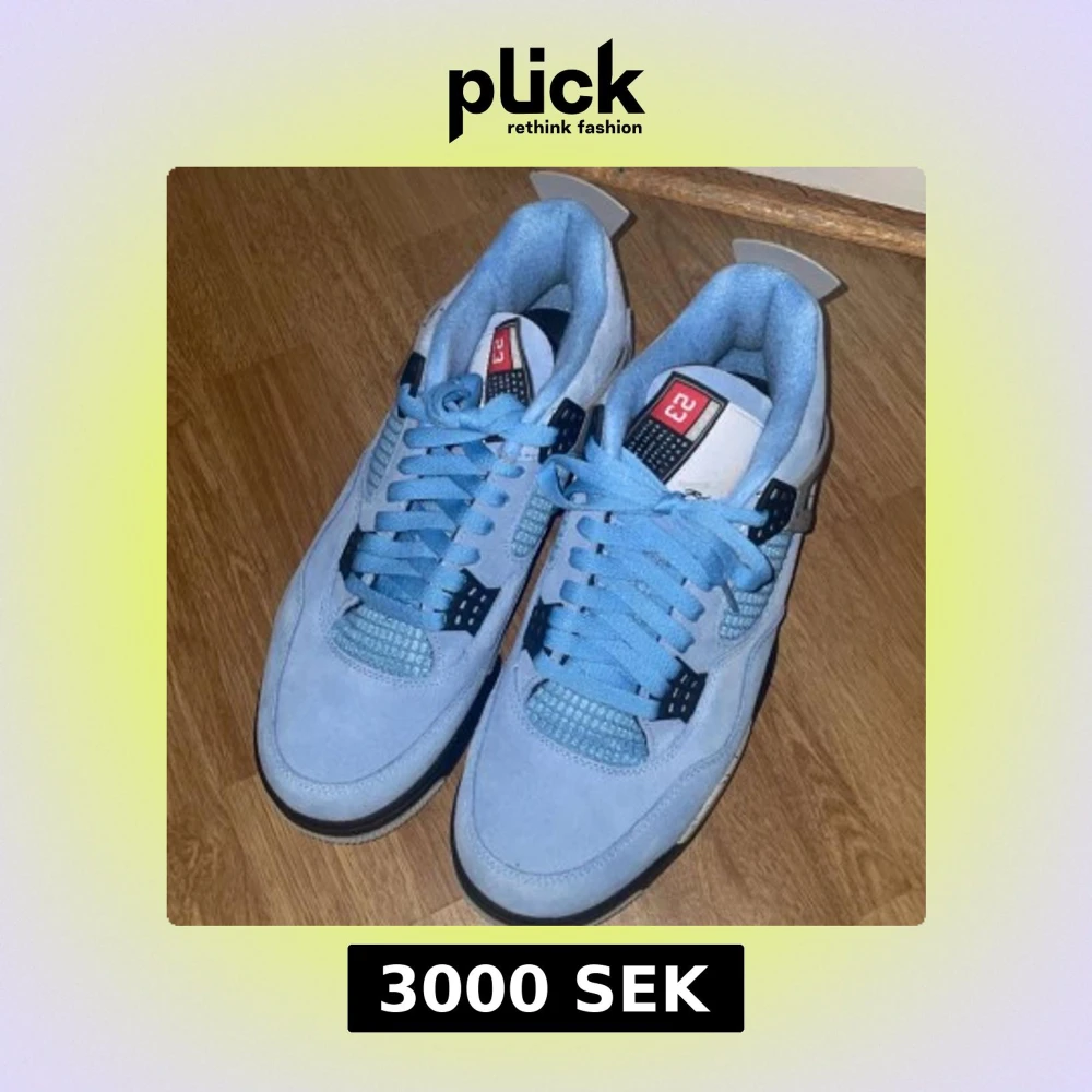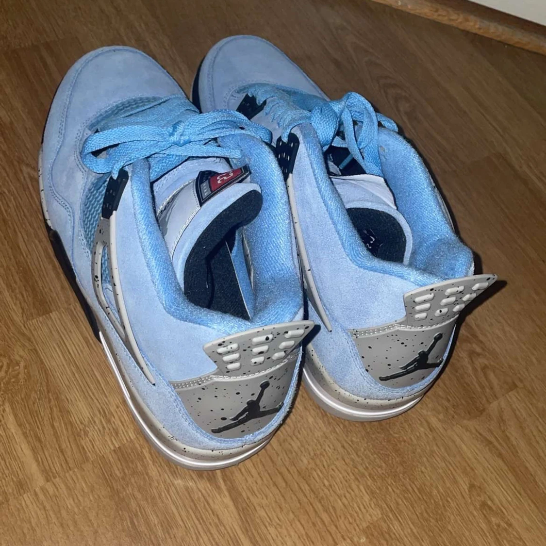 Säljer ett par Nike Air Jordan 4 University Blue sneakers med ljusblå mocka, svarta och grå detaljer samt klassisk Jumpman-logga på hälen. Perfekta för dig som vill sticka ut med en ikonisk och stilren sneaker. Helt ny i skick, använt 2-3 gånger, box medföljer. ÄKTA SÅKLART!