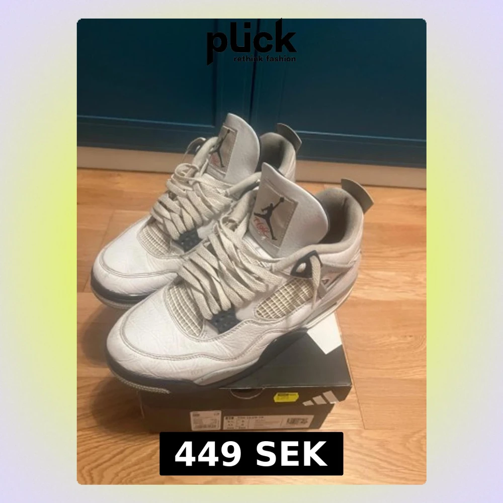 Säljer ett par klassiska Nike Air Jordan 4 sneakers i vitt skinn med mesh-detaljer och svarta accenter. Skorna har den ikoniska Jumpman-loggan på plösen och tjocka vita snören. Perfekta för dig som vill sticka ut med en tidlös och sportig look.