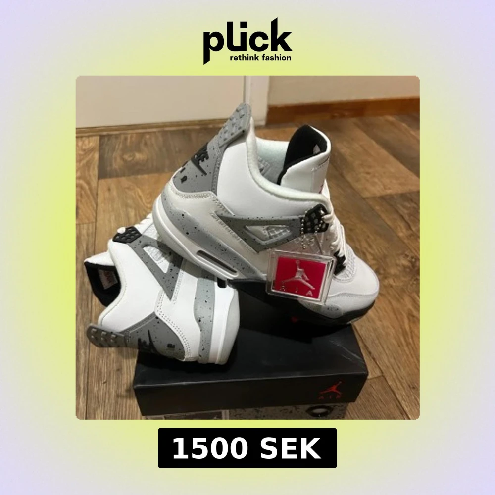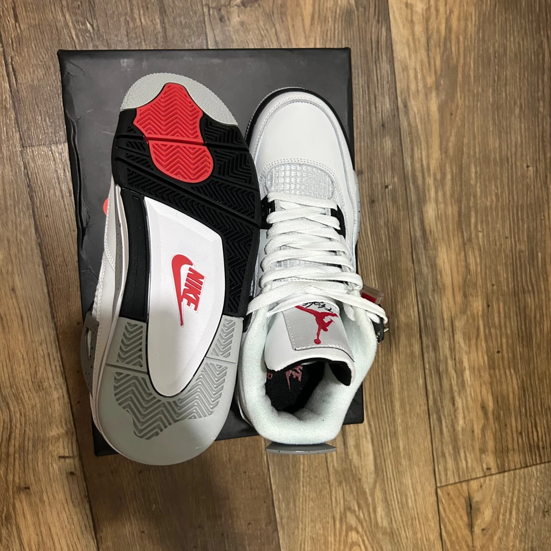 Nike Air Jordan 4 White Cement sneakers med vit och grå ovandel i skinn, svarta och röda detaljer samt speckled mönster på gråa partier. Klassisk Jumpman-logga på plösen och häl, snörning och platt sula. Snygg high-top siluett som sticker ut. Om priset inte är passande, så kan det diskuteras 👍