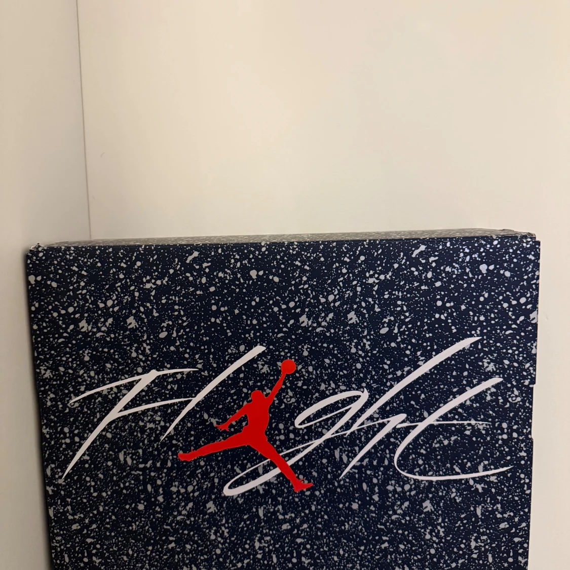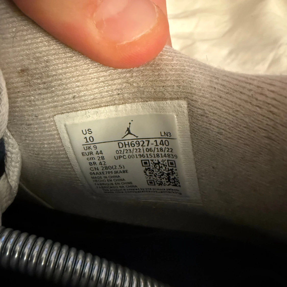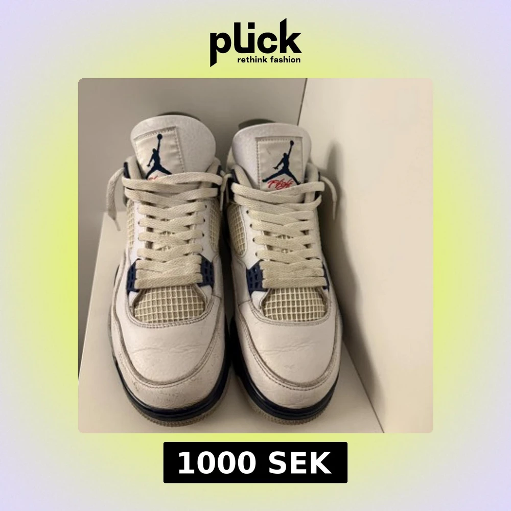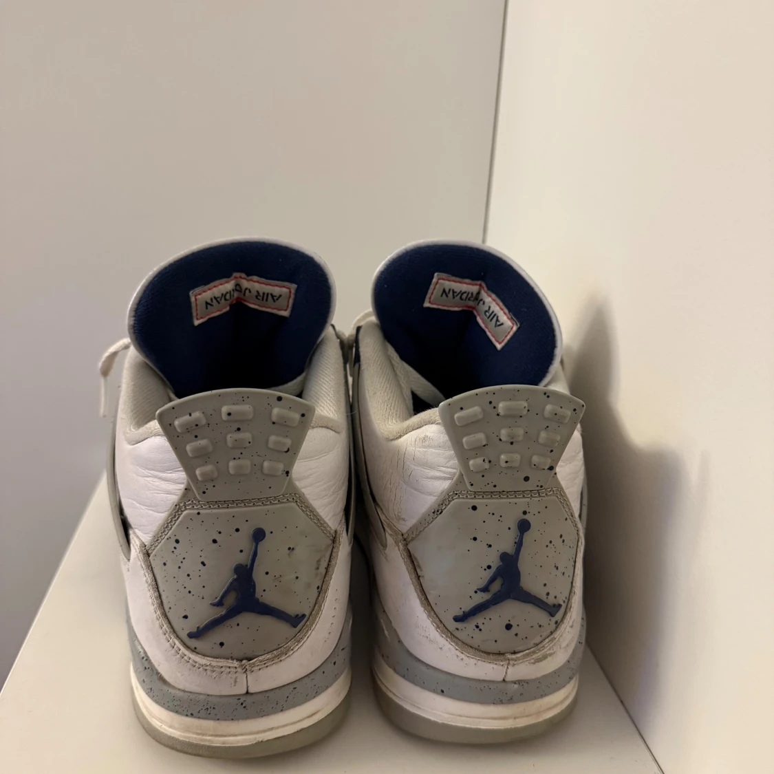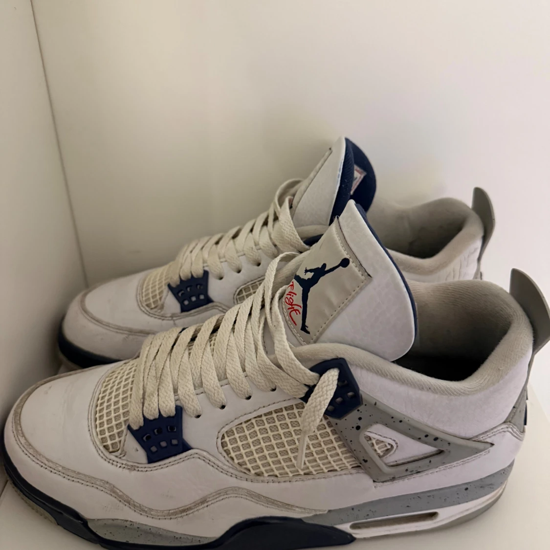 Säljer ett par Nike Air Jordan 4 i vitt och marinblått med klassisk meshpanel, Jumpman-logga på plösen och hälen samt detaljer i grått. Skorna har snörning och platt sula, tillverkade i skinn och syntet. Perfekt för dig som vill sticka ut med en ikonisk sneaker. Köpt hos Soleplus.