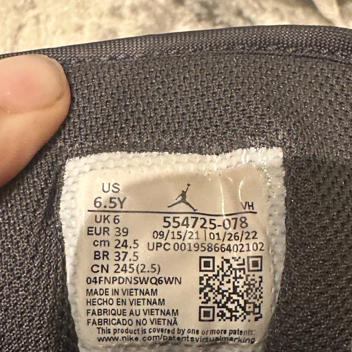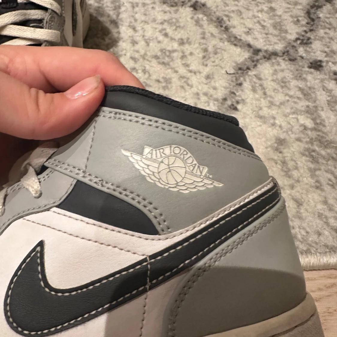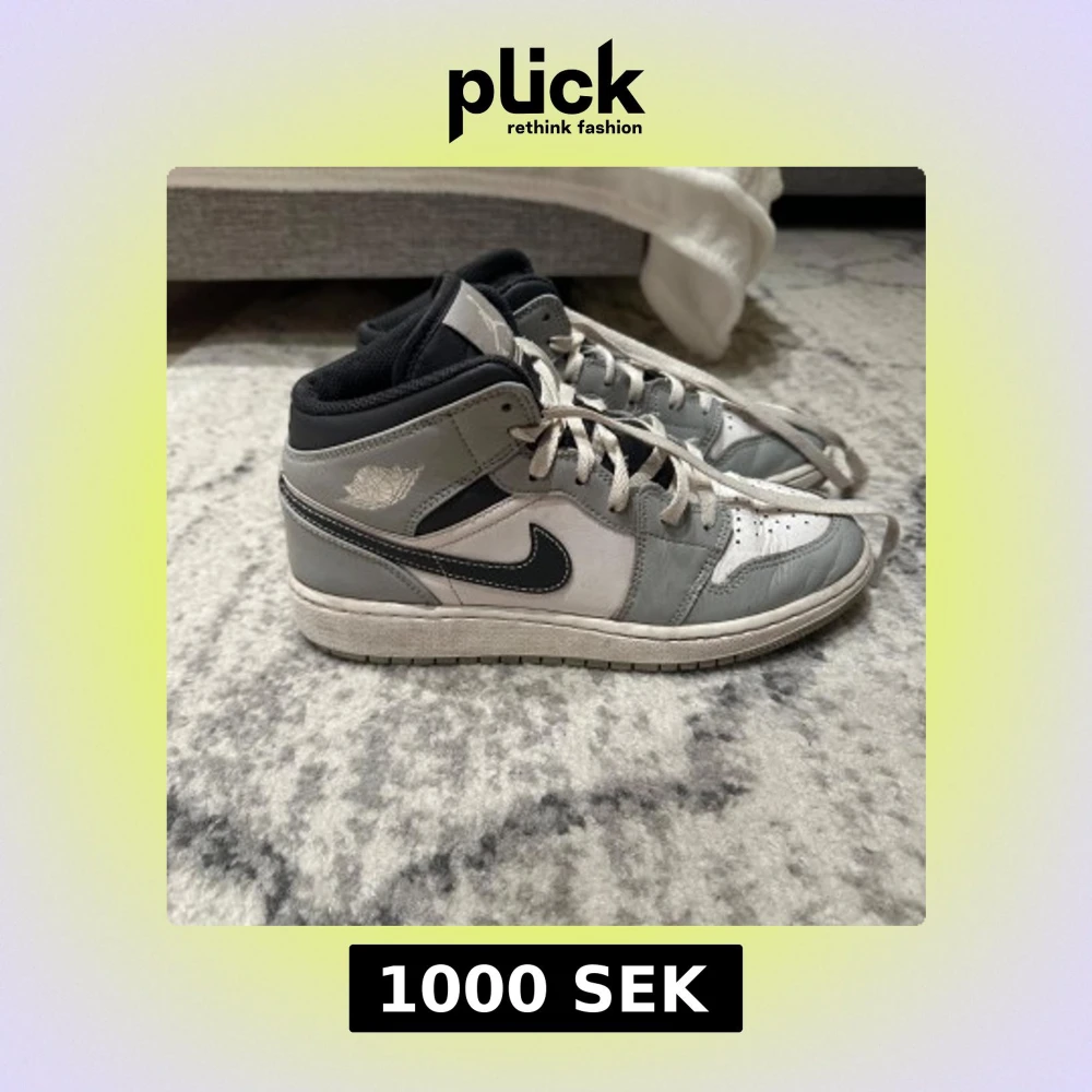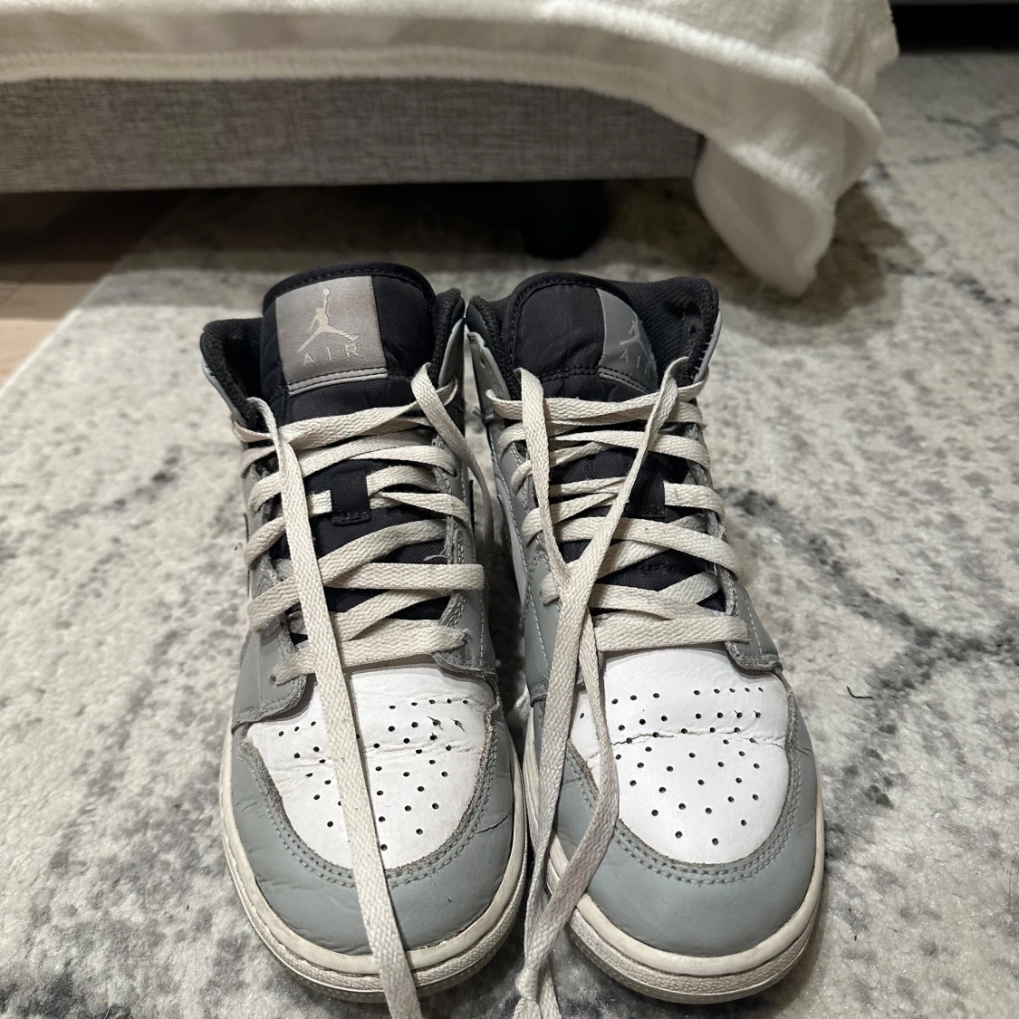 Säljer ett par stilrena Nike Air Jordan 1 sneakers i grått och vitt. Skorna har klassisk snörning och den ikoniska Air Jordan-loggan på sidan. Perfekta för dig som vill ha en sportig och trendig look.