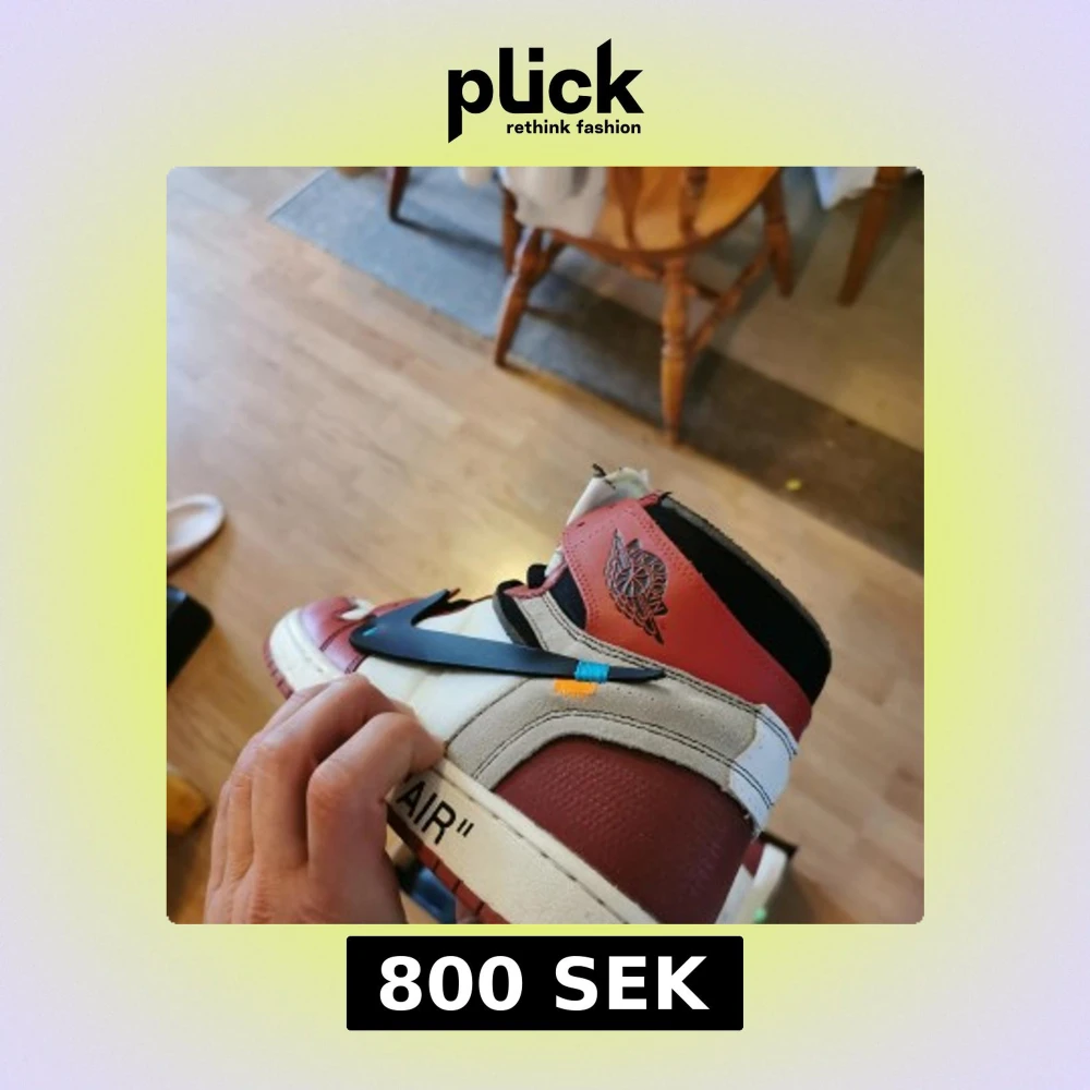 Säljer ett par Nike Air Jordan Off-White i rött, vitt och svart. Skorna har en unik design med textdetaljer på sidan och den ikoniska swoosh-loggan. Inte auténtico.