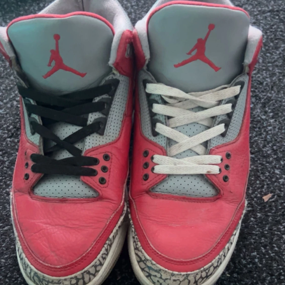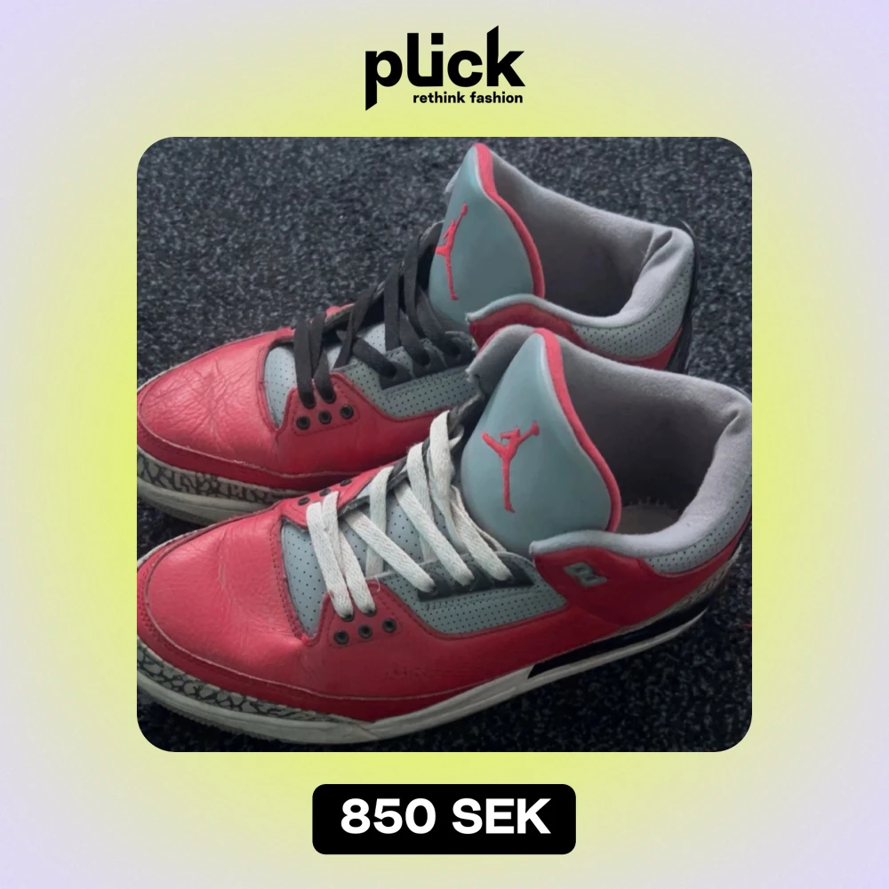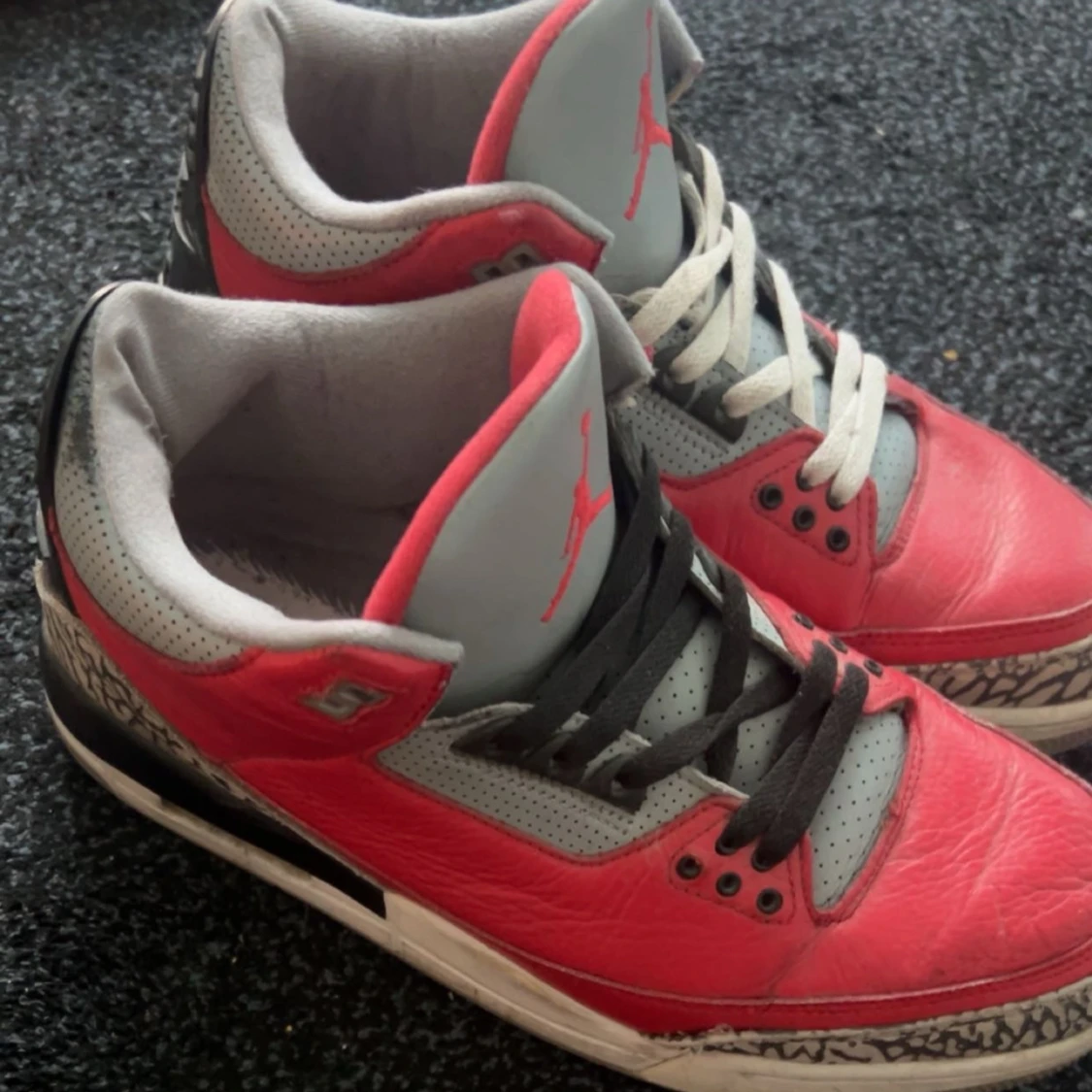 Säljer ett par Nike Air Jordans i röd och grå färg. Skorna har en cool design med svart och vit snörning och den klassiska Jumpman-loggan på plösen. Perfekta för både vardag och sportiga tillfällen. De har en unik stil med elefantmönster på sulan.