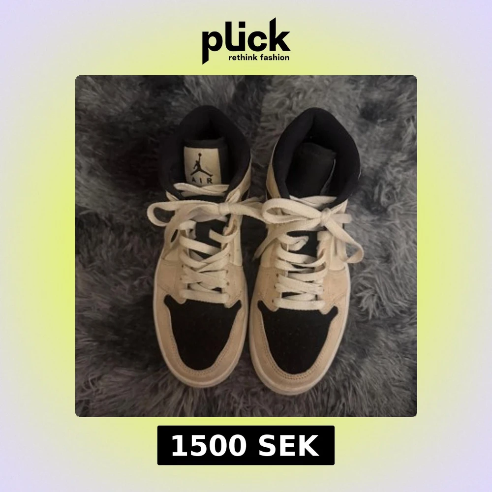 Säljer ett par Nike Air Jordans med beige mockadetaljer och svarta partier. Skorna har klassisk snörning, hög modell och den ikoniska swoosh-loggan på sidan. Perfekta för dig som gillar streetwear och sneakers med stil. Storlek 38