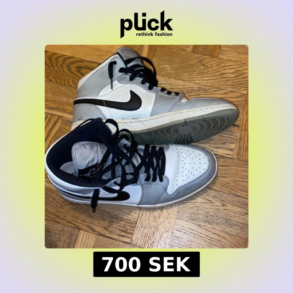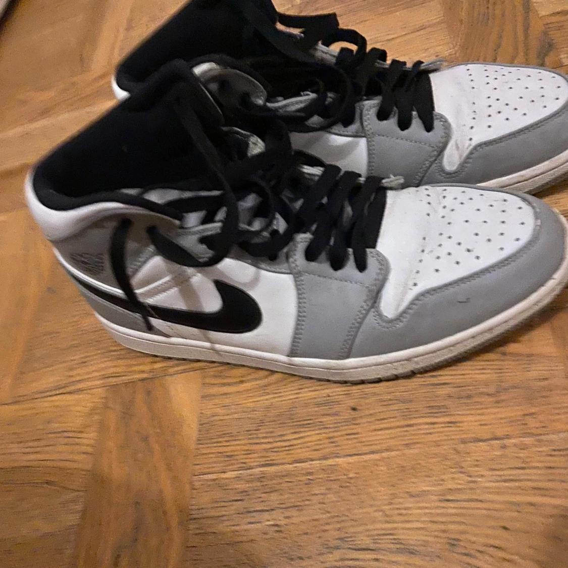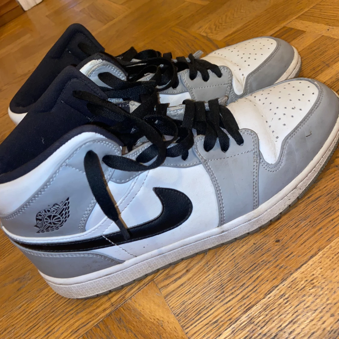 Snygga Nike Air Jordans i grått och vitt med svart swoosh. Skorna har hög modell med snörning och perforerad tå för extra ventilation. Perfekta för en stilren look.