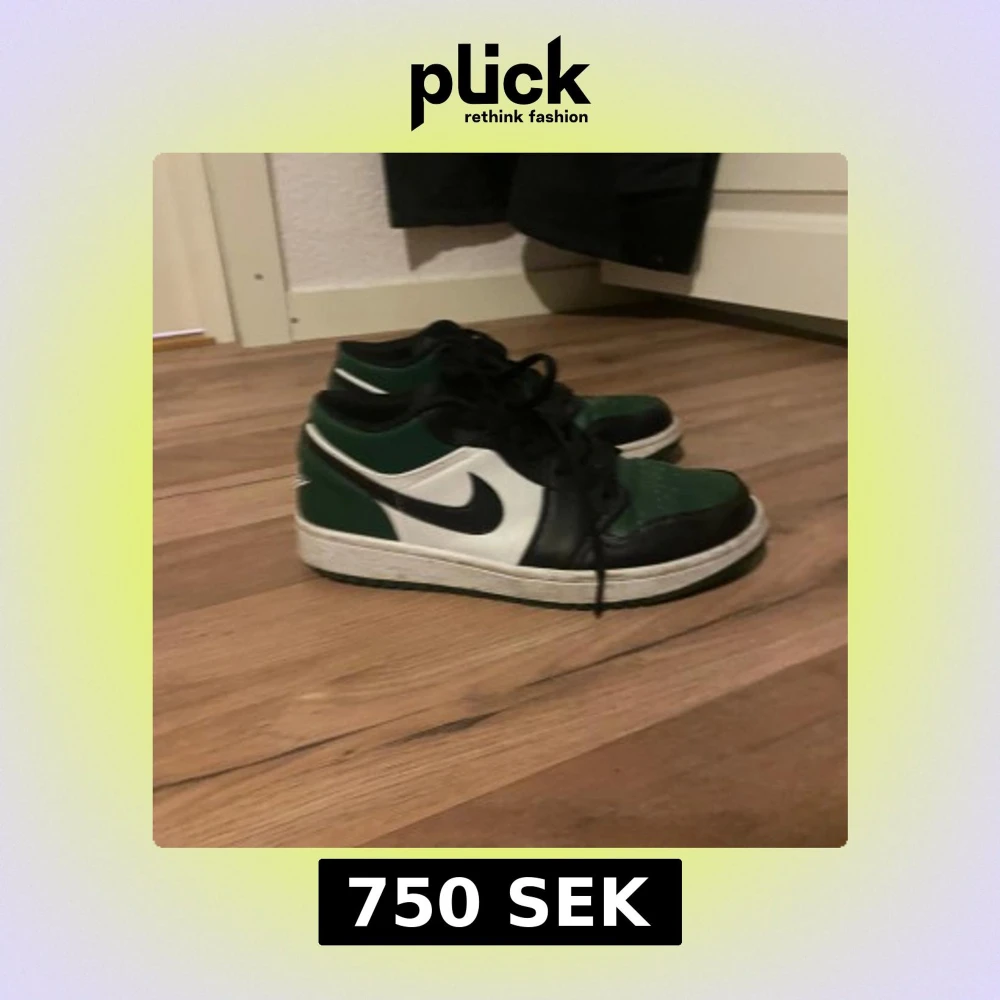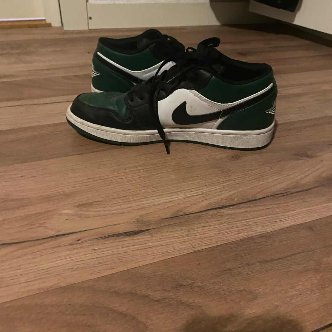 Snygga Nike Air Jordans i grönt, svart och vitt. Skorna har en klassisk design med snörning och den ikoniska Nike-loggan på sidan. Perfekta för en sportig look.Priset kan diskuteras vid snabb köp