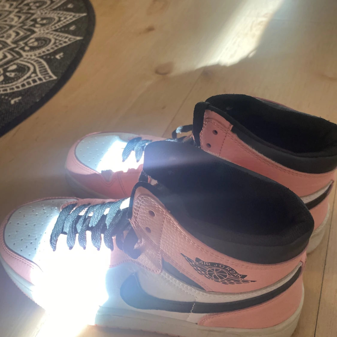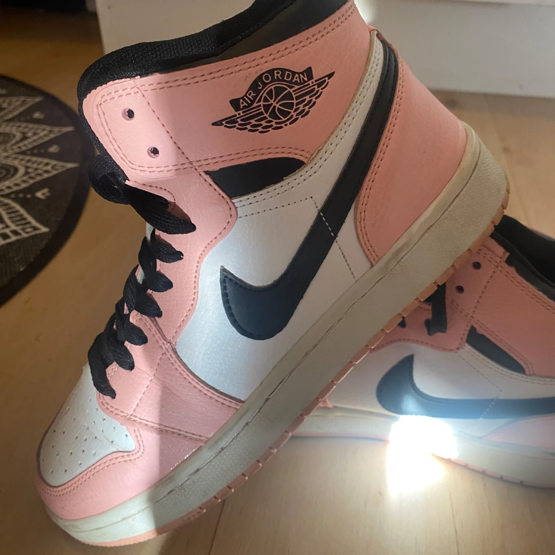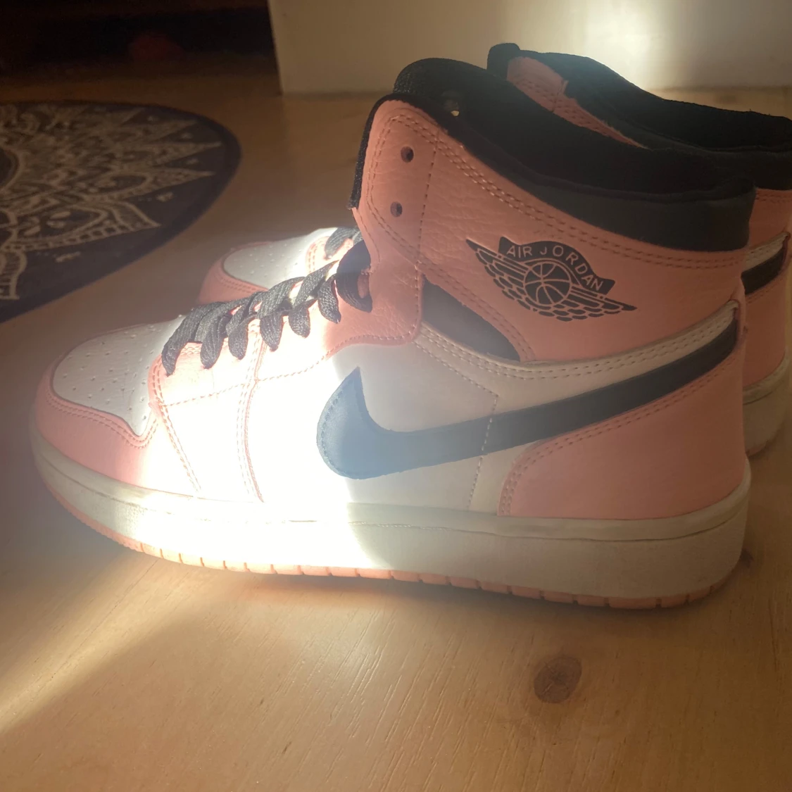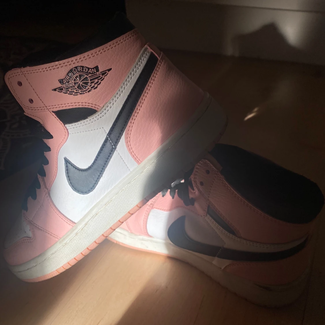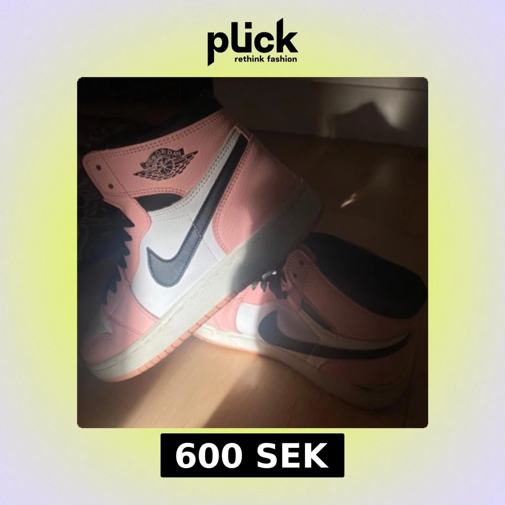 Snygga Nike Air Jordans i en fräsch kombination av rosa, svart och vitt. Skorna har den klassiska Air Jordan-loggan på sidan och svart snörning. Perfekta för att ge din outfit en sportig touch.