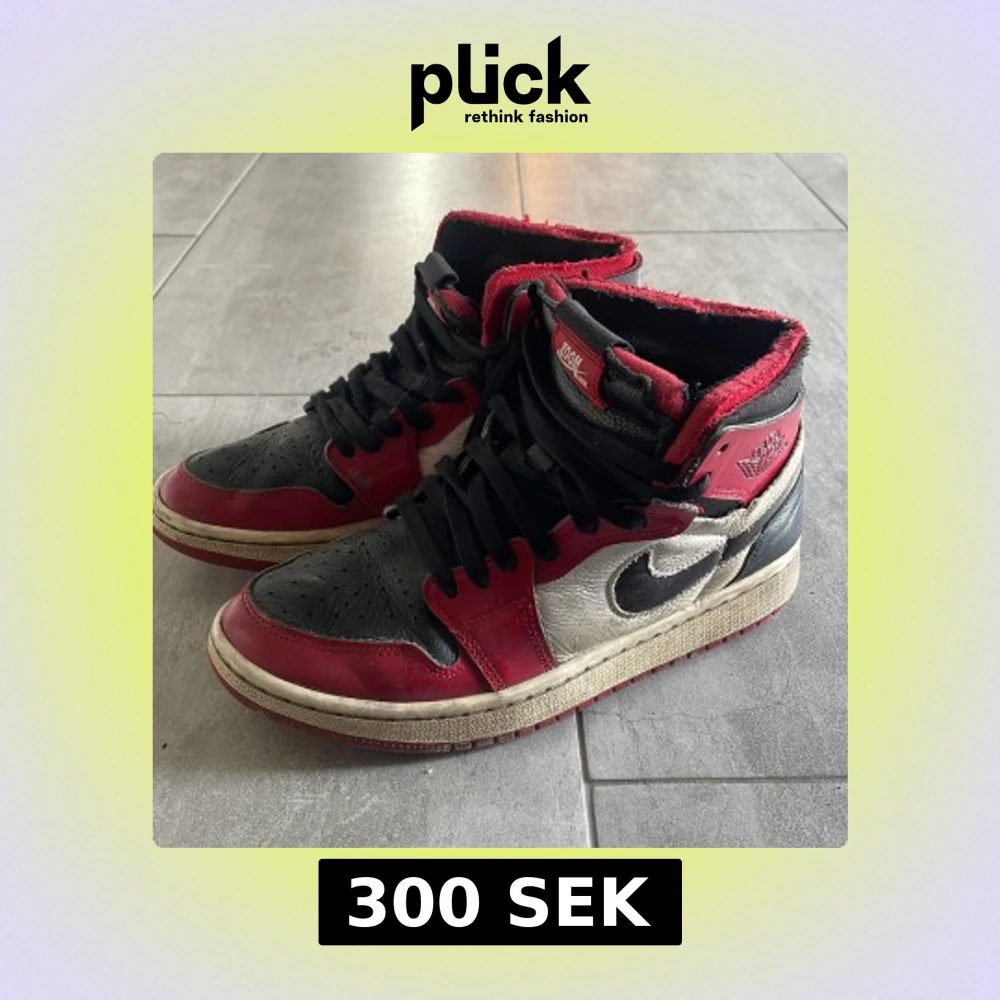 ⚠️SKORNA TVÄTTAR MED SKO PUTS INNAN SÄLJNING⚠️. Snygga Nike Air Jordans i en klassisk färgkombination av rött, svart och vitt. Skorna har en hög design med snörning och den ikoniska Nike-loggan på sidan. Perfekta för dig som vill ha en stilren och sportig look.