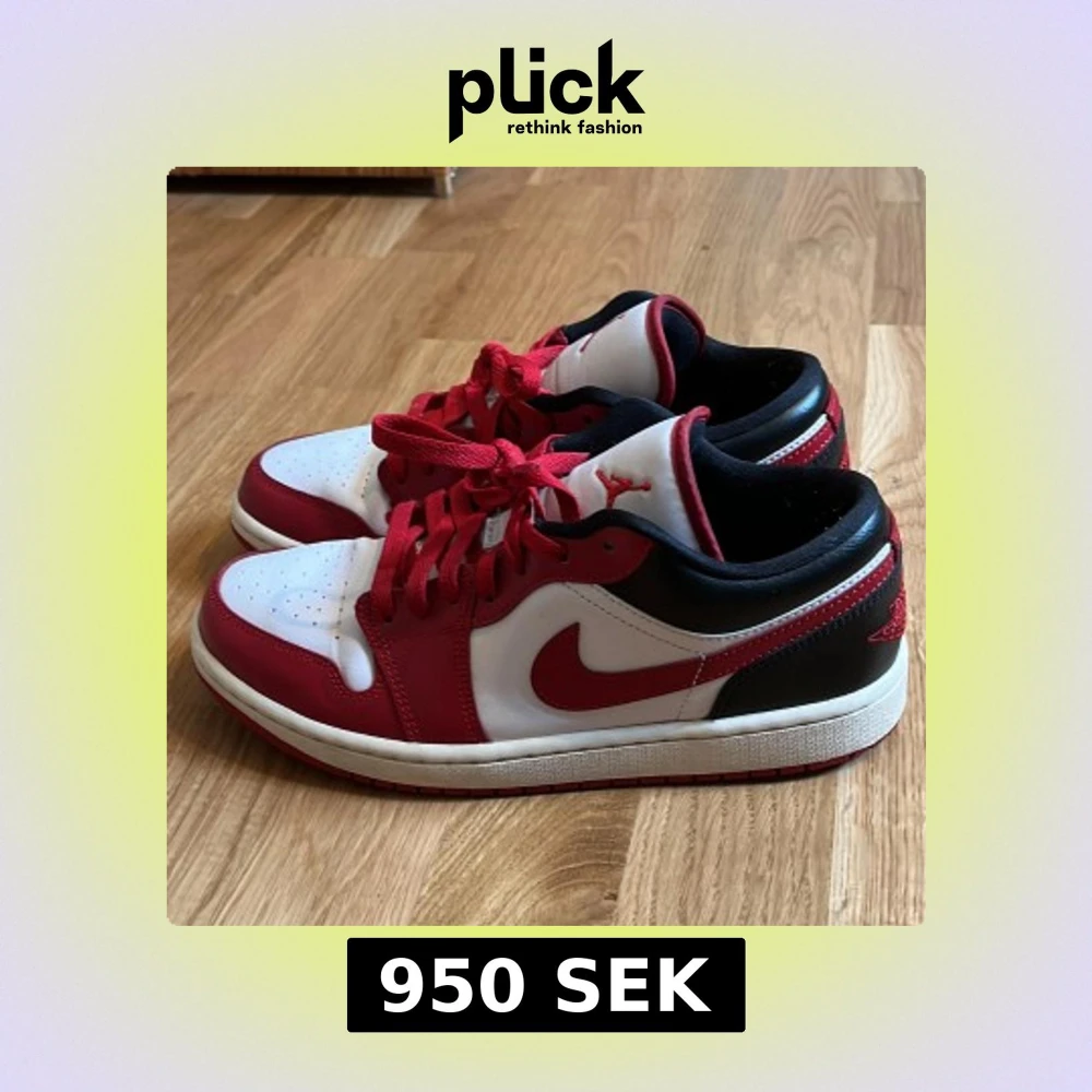 Snygga Nike Air Jordans i en klassisk röd och vit färgkombination. Skorna har en låg profil med snörning och en ikonisk Nike-logga på sidan. Perfekta för dig som vill ha en stilren och sportig look.
